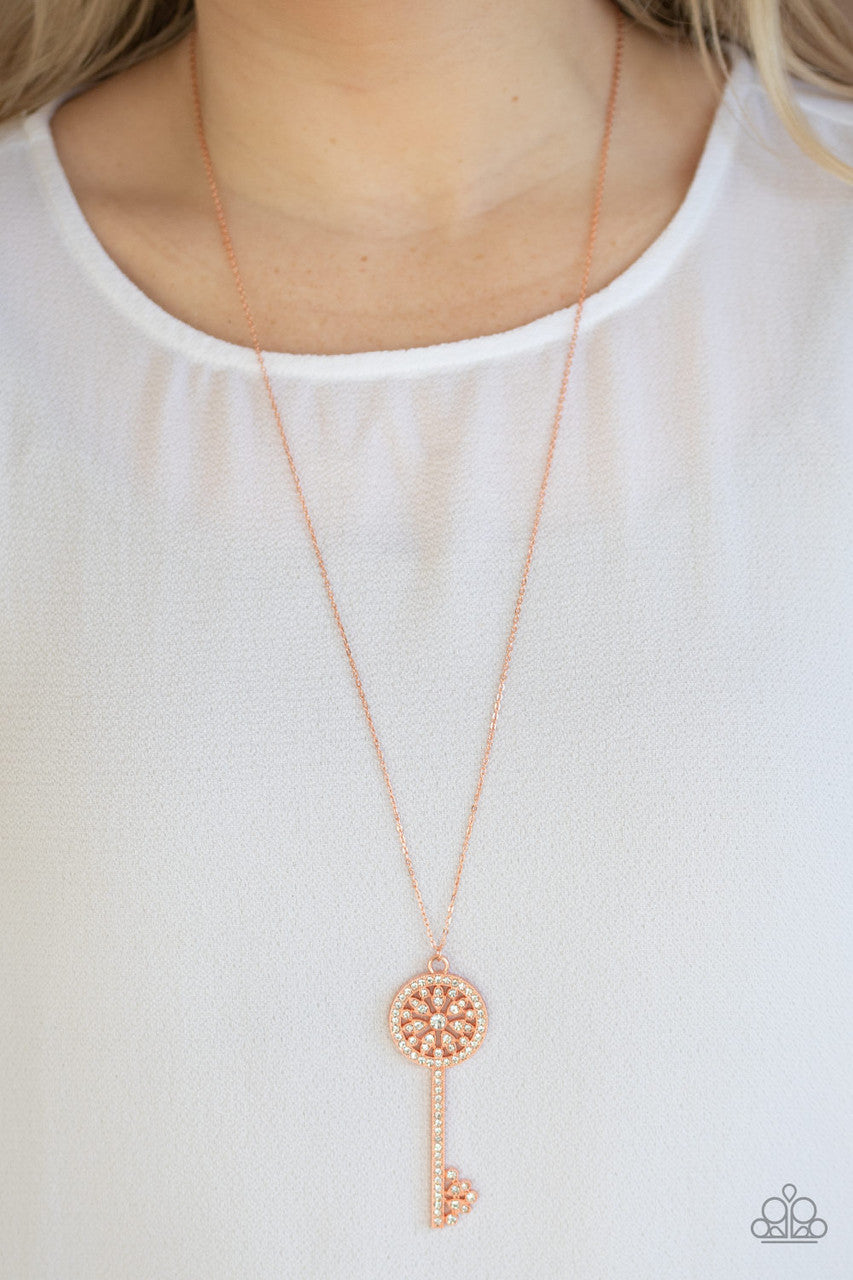 Encrusted in glittery white rhinestones, a sparkly shiny copper key swings from the bottom of a lengthened shiny copper chain for a refined look. Features an adjustable clasp closure.