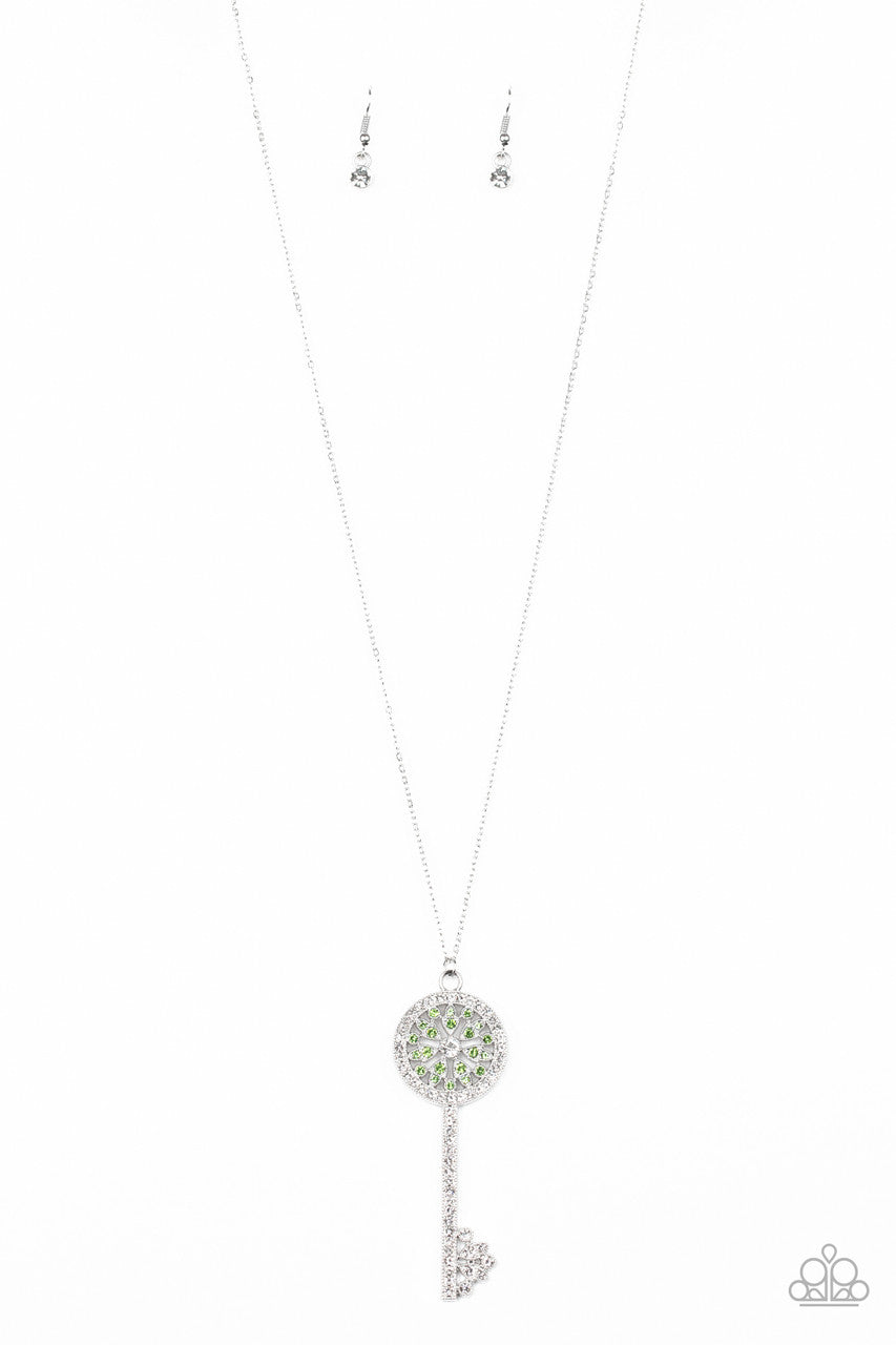 Encrusted in glittery green and white rhinestones, a sparkly silver key swings from the bottom of a lengthened silver chain for a refined look. Features an adjustable clasp closure.