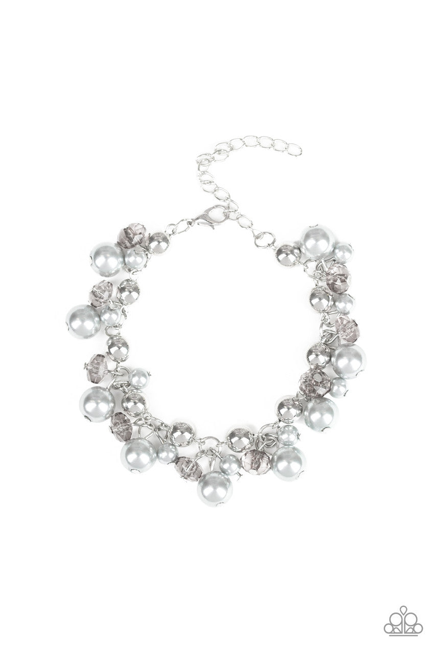 A refined collection of silver beads, silver pearls, and smoky crystal-like beads cluster around the wrist, creating a timeless fringe. Features an adjustable clasp closure.
