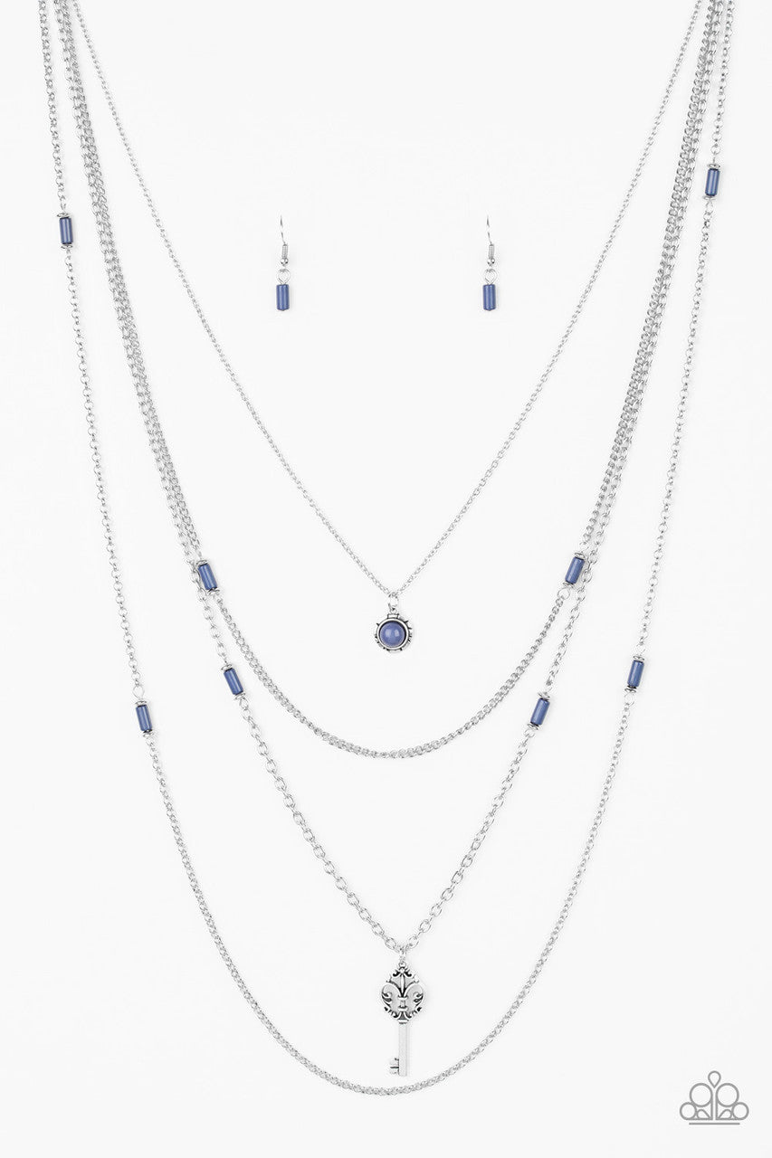 Featuring shiny blue and dainty silver accents, a blue beaded pendant gives way to a shimmery silver key for a whimsically layered look. Features an adjustable clasp closure.