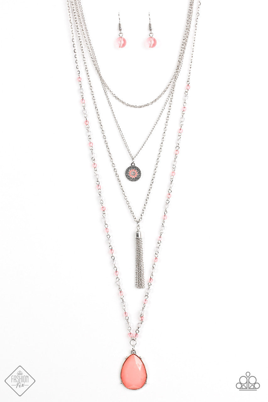 Varying in shape and cut, four shimmery silver chains layer down the chest. Painted in refreshing Peach Echo detail, a dainty floral frame gives way to a shimmery silver tassel and a dramatic Peach Echo teardrop. Smoky and shimmery Peach Echo crystal-like beads are sprinkled along the lowermost chain for a whimsical finish. Features an adjustable clasp closure.
