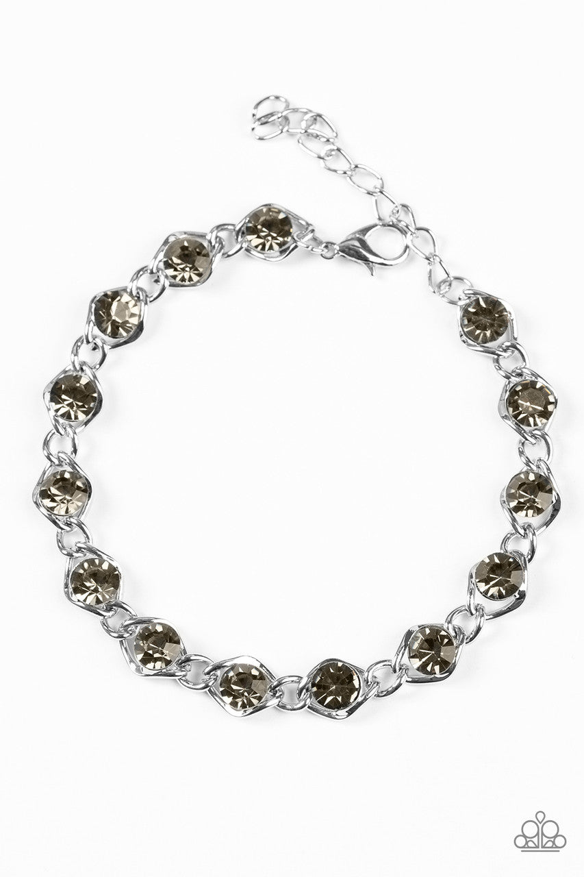 Oversized smoky rhinestones are sprinkled along a glistening silver chain, creating bold shimmer around the wrist. Features an adjustable clasp closure.