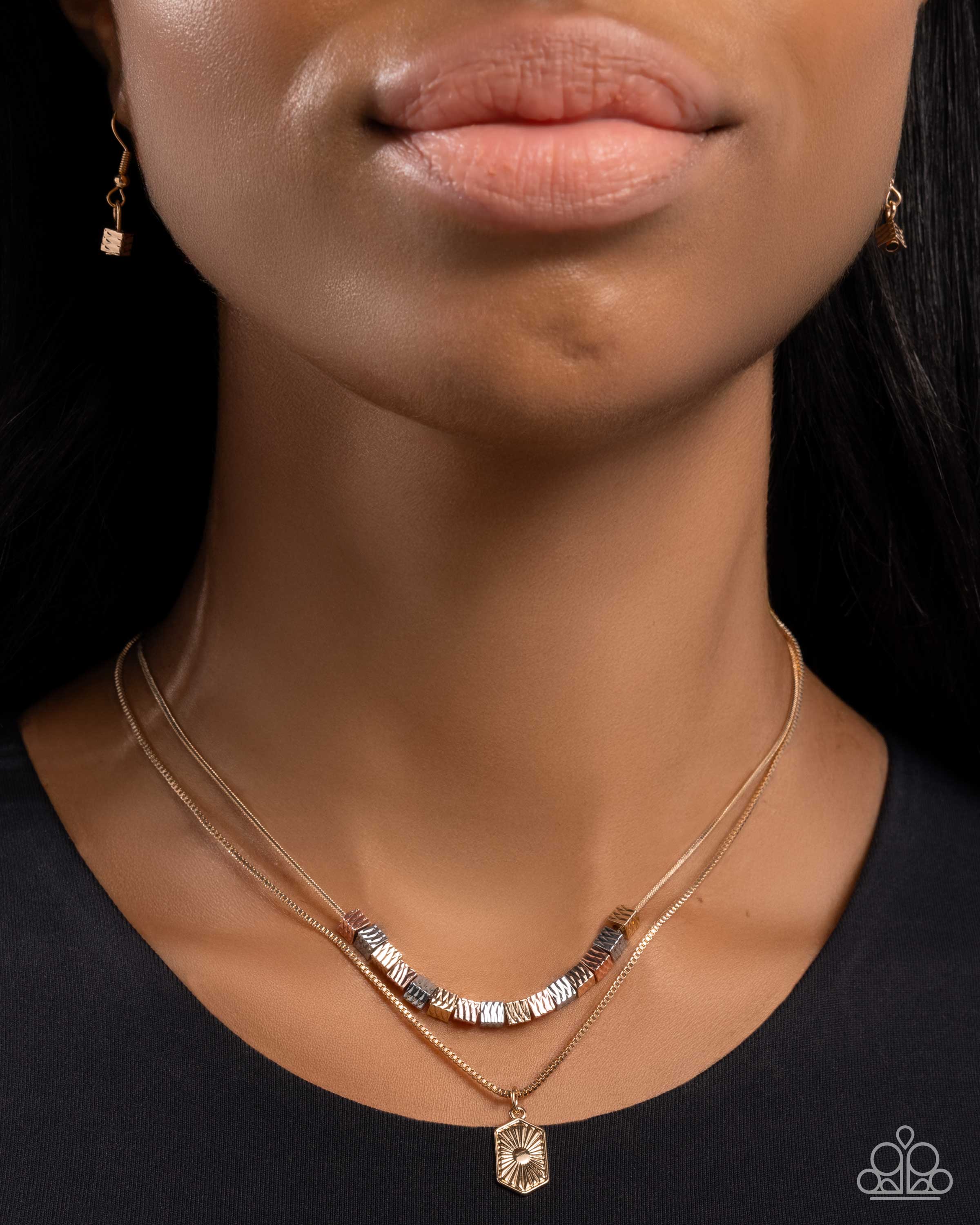 Infused along a gold snake chain, a collection of textured silver, gold, and rose gold framed beads glides above a gold box chain for a layered luminescent display. A solitaire gold stud dots the center of an elongated gold sunburst-textured frame that glides along the lowermost gold box chain for a trendy tantalizing finish. Features an adjustable clasp closure.