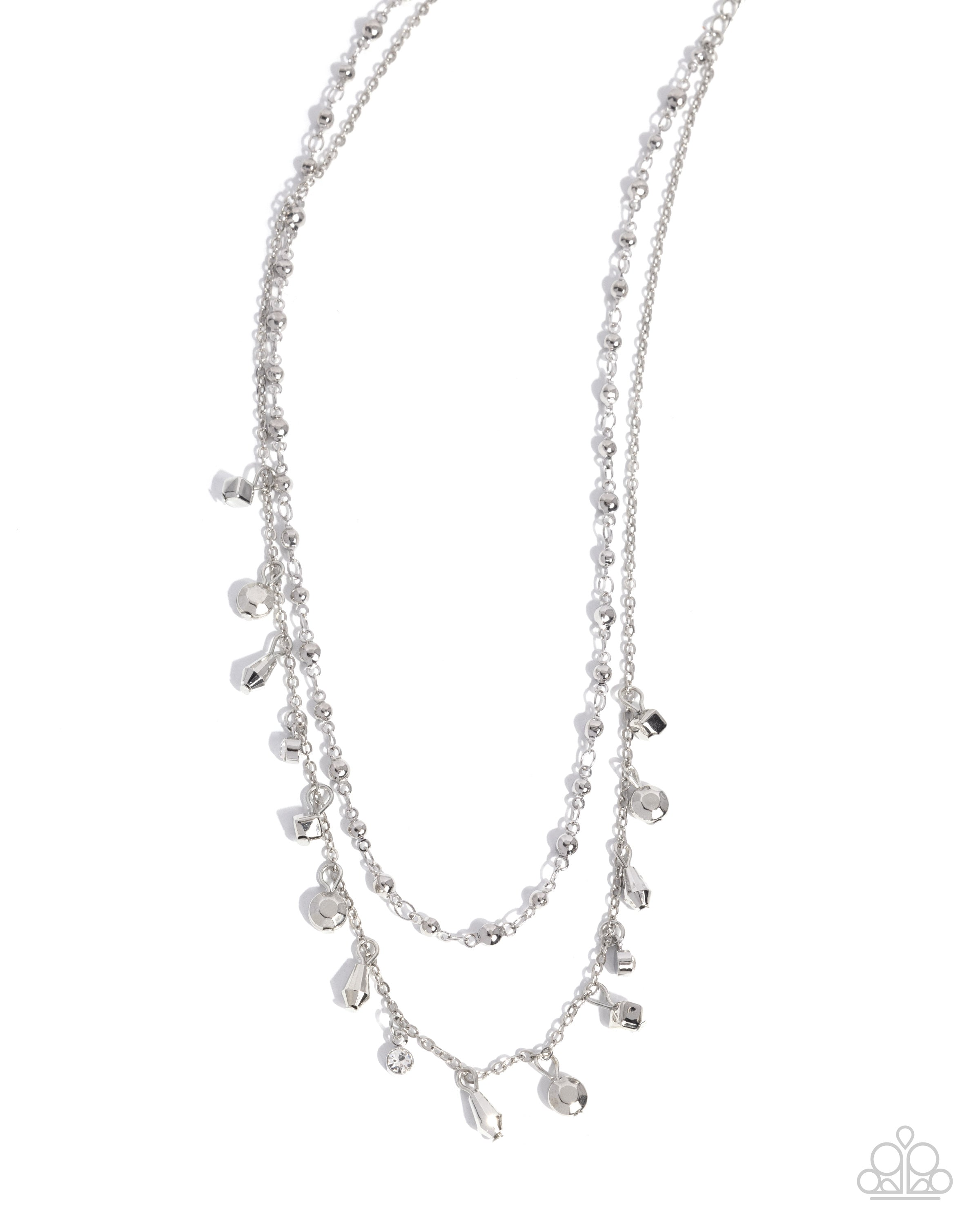 Layering with a silver satellite chain, a dainty silver chain with swaying silver cubes, cylinders, smashed faceted beads, and white rhinestones coalesces below the neckline for an attention-grabbing look. Features an adjustable clasp closure.