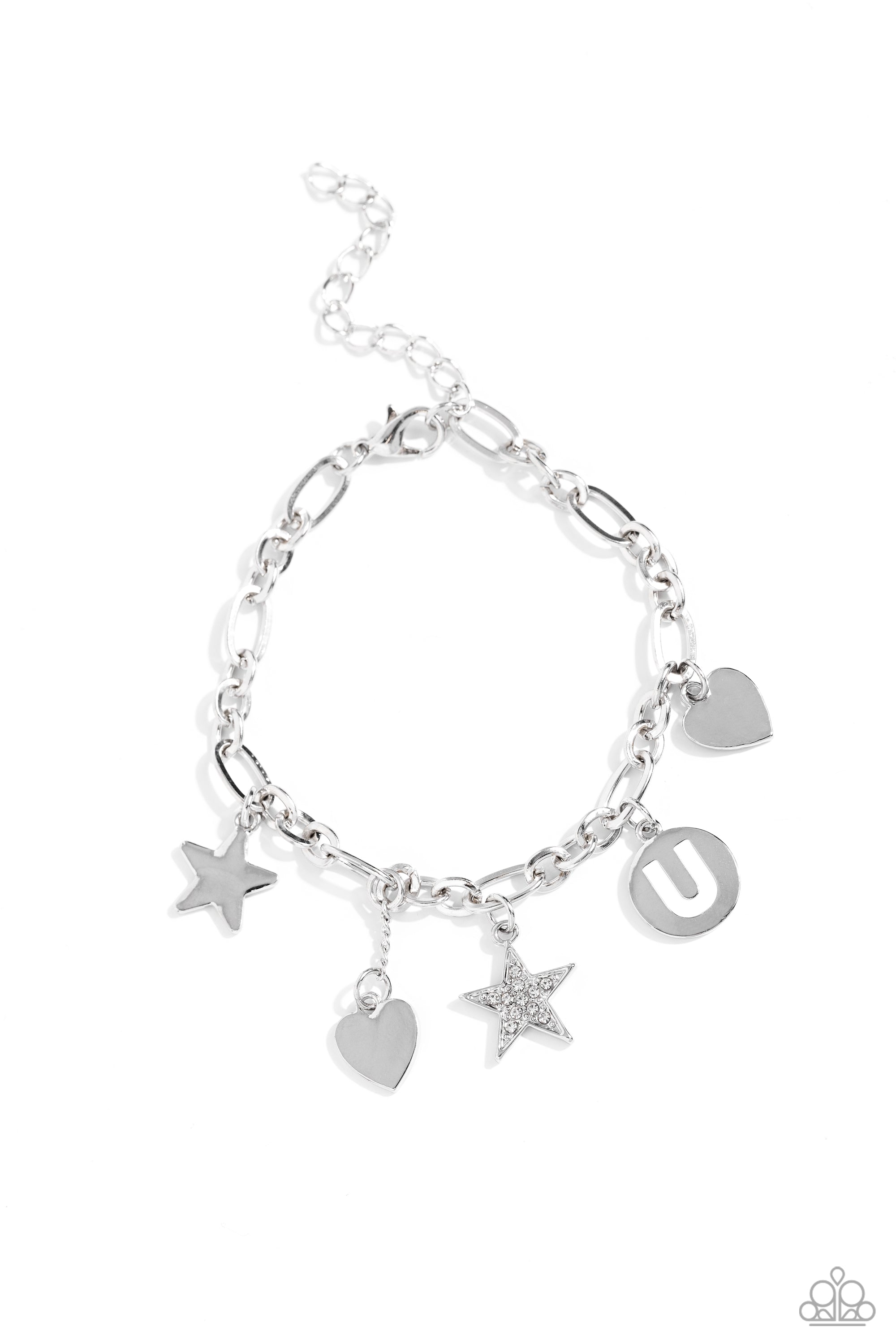 A strand of silver chain is decorated with sentimental charms, including a white rhinestone-encrusted and sleek silver star, a hammered and sleek silver heart, and a white-painted "U" silver pendant for a charismatic display around the wrist. Features an adjustable clasp closure.