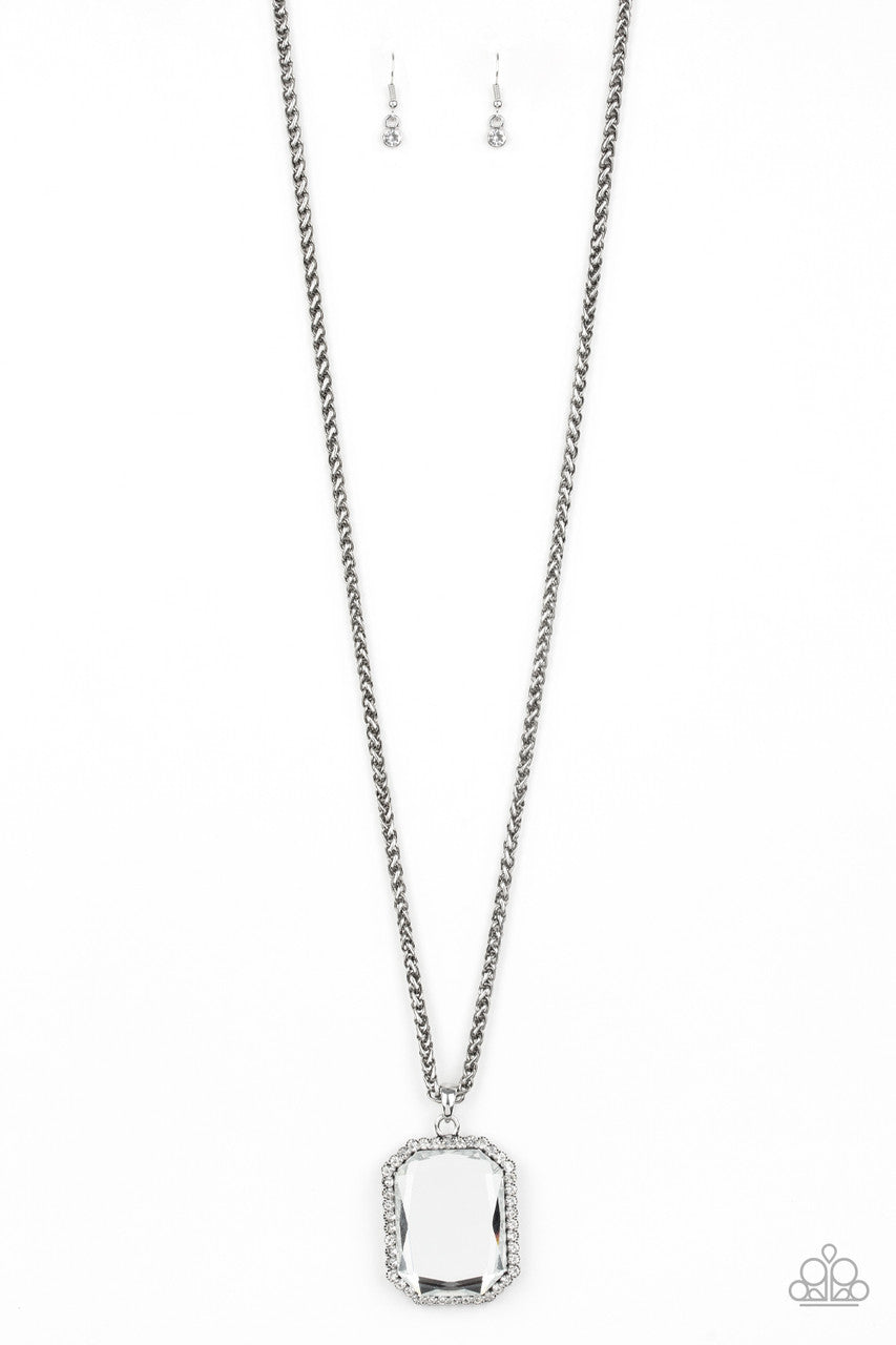 Bordered in dainty white rhinestones, an oversized faceted white emerald style gem swings from the bottom of an antiqued silver wheat chain for a blinding look. Features an adjustable clasp closure.