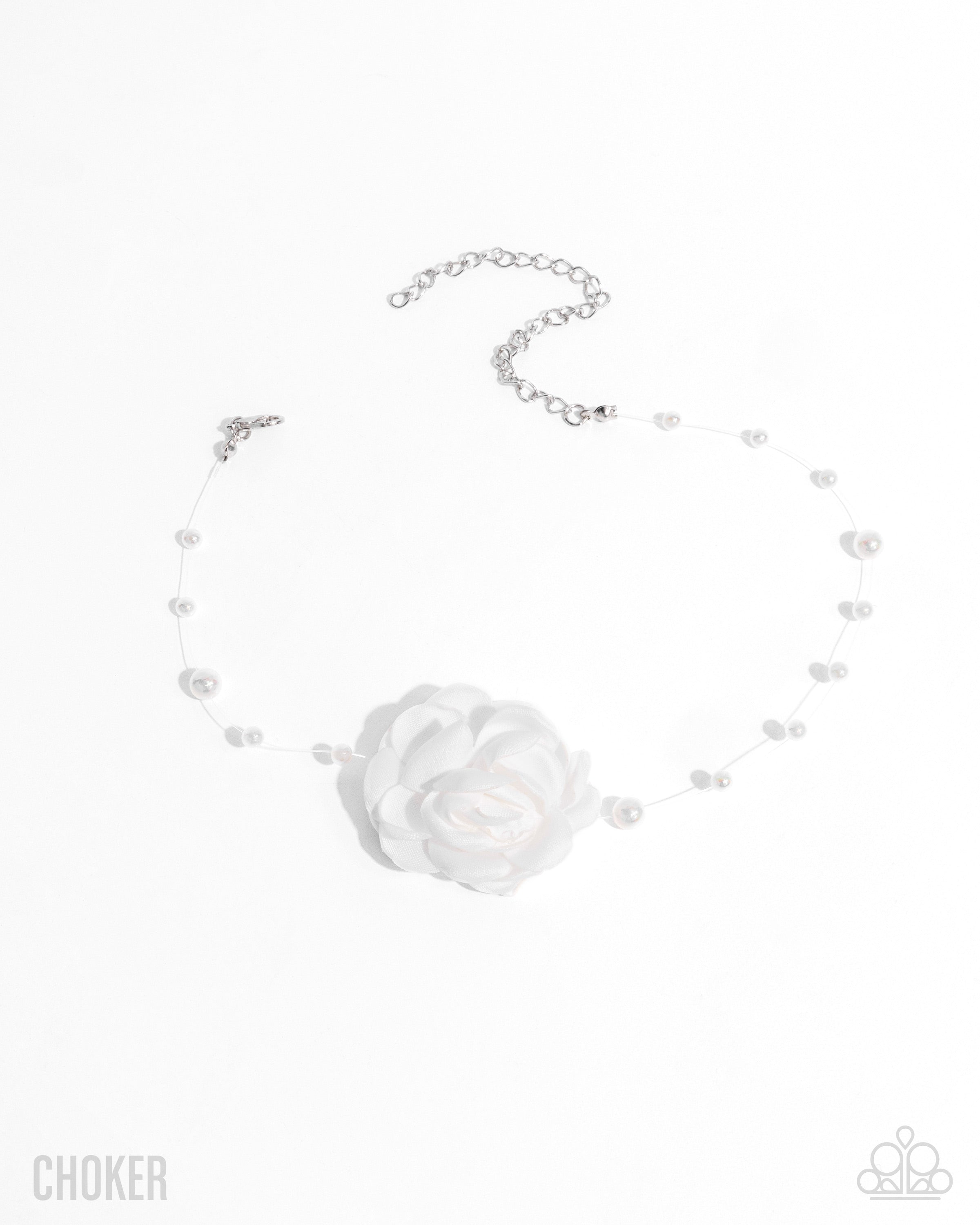 Delicate white pearls are threaded along an invisible wire, creating an airy and lightweight design. A large white flower sits prominently at the center, adding a soft, elegant touch to the necklace. Features an adjustable clasp closure.