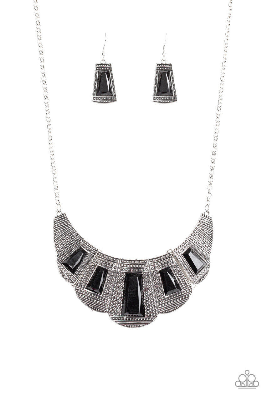 Featuring faceted emerald style cuts, bold geometric black beads are pressed into studded silver frames that dramatically link below the collar for a fierce finish. Features an adjustable clasp closure.