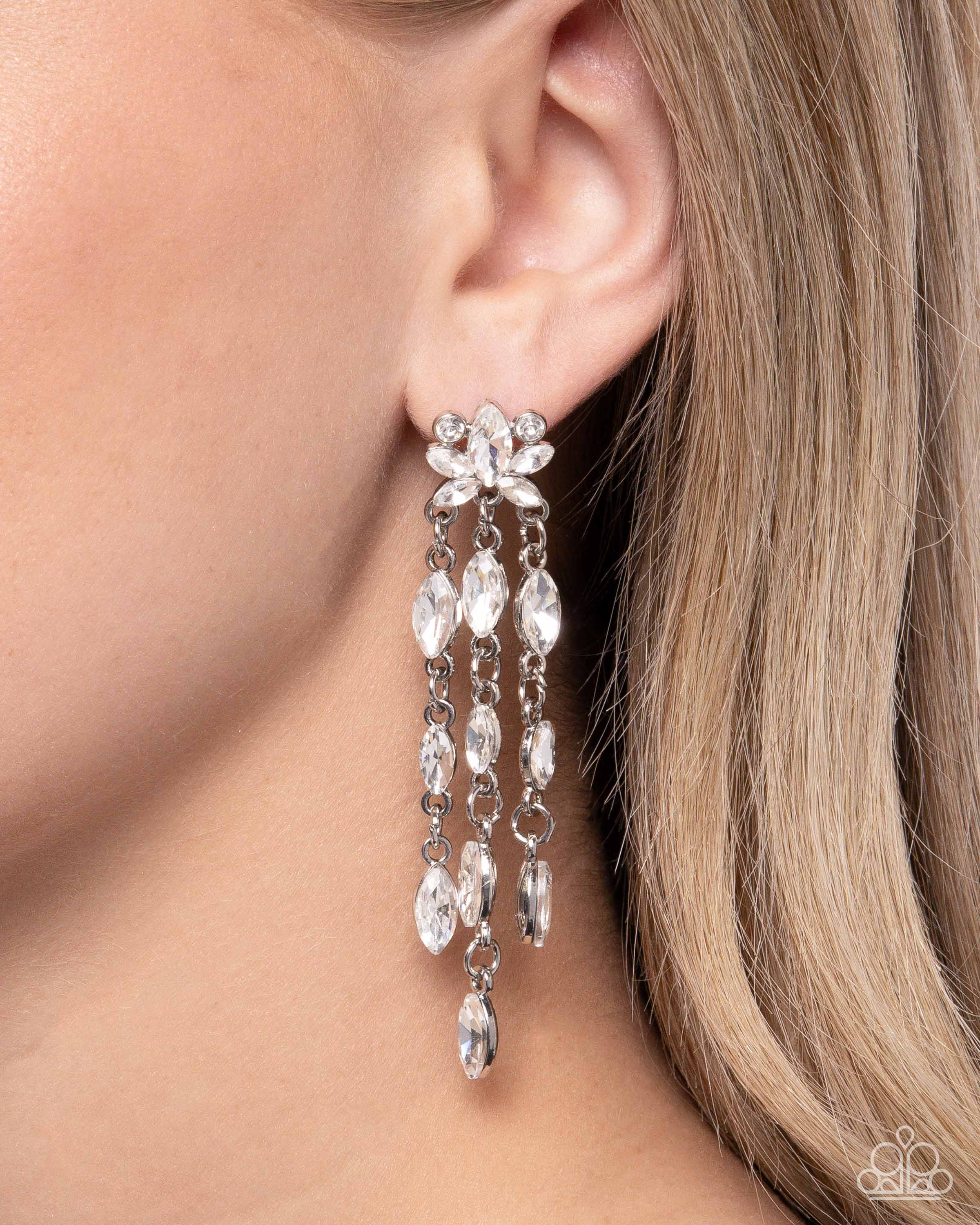 A trio of marquise-cut white gem-embellished chain strands are suspended and taper from a glittery explosion of round and marquise-cut white gems in varying sizes for a light-catching lure of luxury. Earring attaches to a standard post fitting.