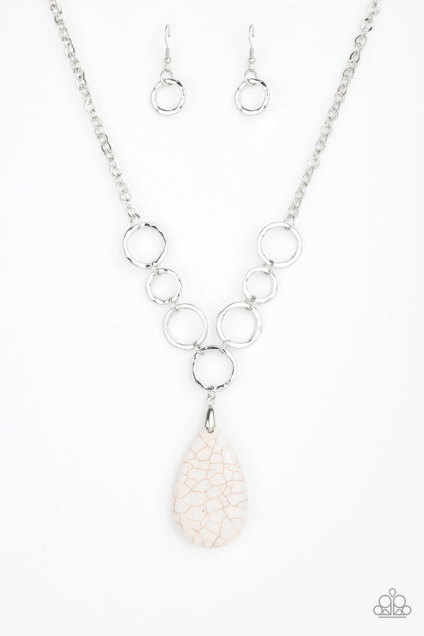 A collection of silver links give way to a refreshing white stone teardrop, creating a tranquil pendant below the collar. Each silver ring is hammered in texture, adding an artisanal touch to the piece. Features an adjustable clasp closure.