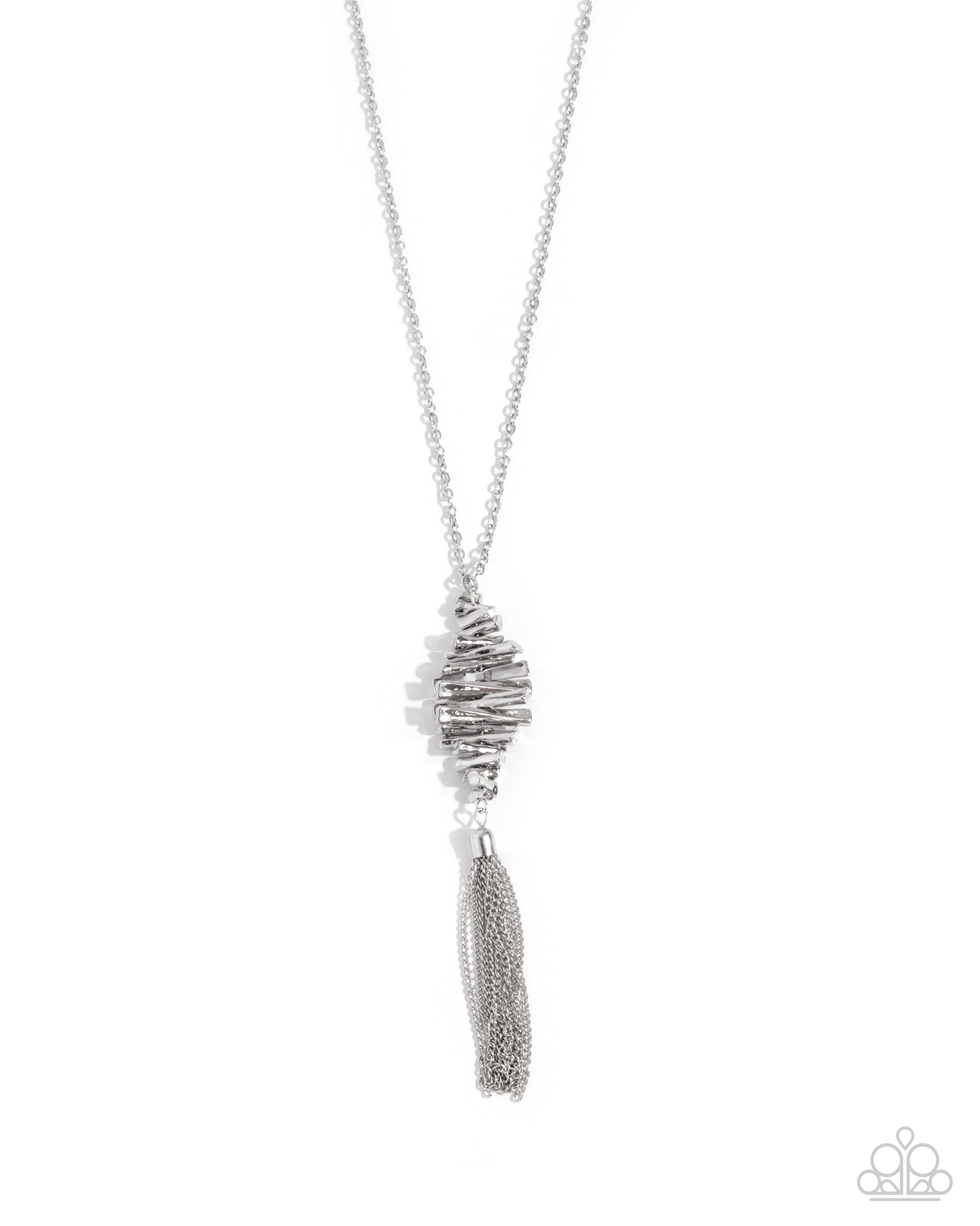 Gliding along an extended silver chain, shorn bars of hammered silver layer and stack atop one another in an edgy manner, giving way to a tassel of classic silver chains for a dramatically dauntless display. Features an adjustable clasp closure.