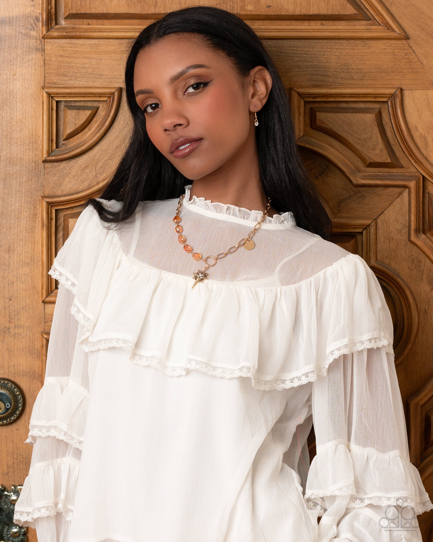 Connecting to a sleek gold ring, an antiqued gold paperclip chain is interrupted by transparent chiseled tea acrylics on the left-hand side while a sleek gold disc swings on the right-hand side for a mismatched display. A three-dimensional studded and textured antiqued gold star dotted with a quartet of white rhinestones swings along the sleek gold ring for a cosmically chic display. Features an adjustable clasp closure.