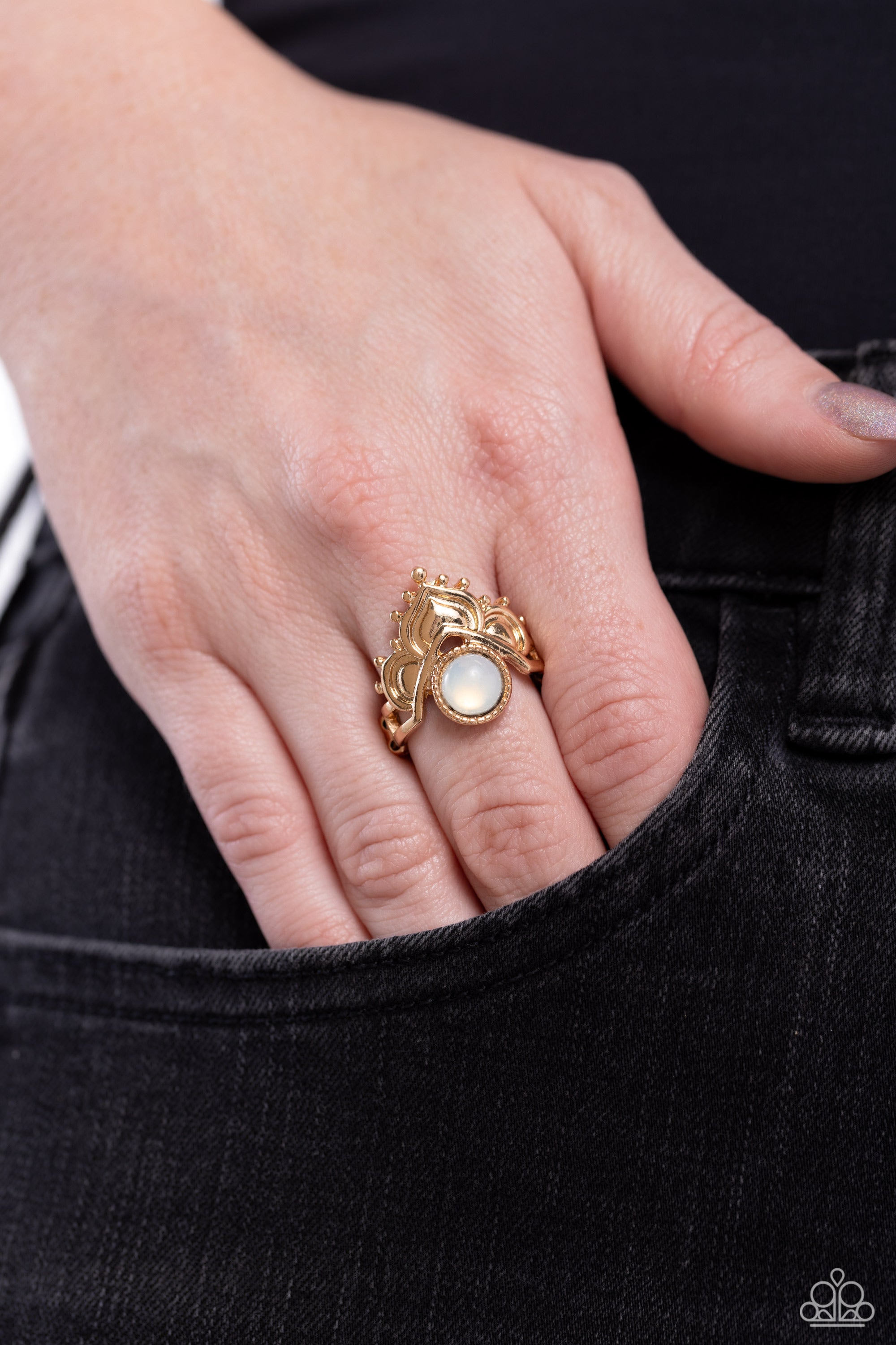 Studded gold lotus-like petals adorn the top of a white opal bead, creating an ethereal centerpiece across the finger. Features a dainty stretchy band for a flexible fit.