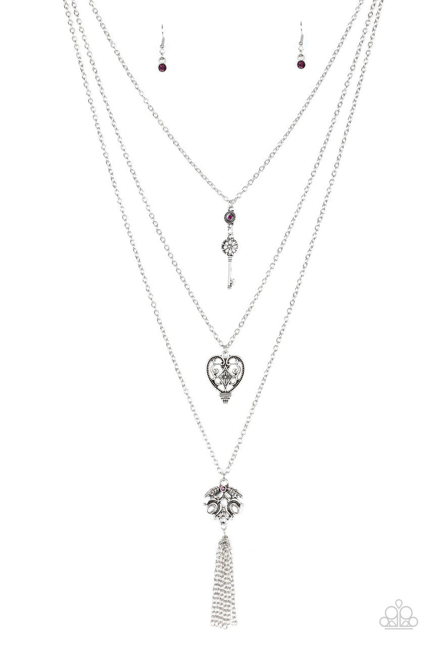 A shimmery silver key, heart-like frame, and leafy silver pendant layer down the chest in a whimsical fashion. Infused with a playful tassel, glittery purple rhinestones adorn the upper and lowermost frames for a sparkling finish. Features an adjustable clasp closure.