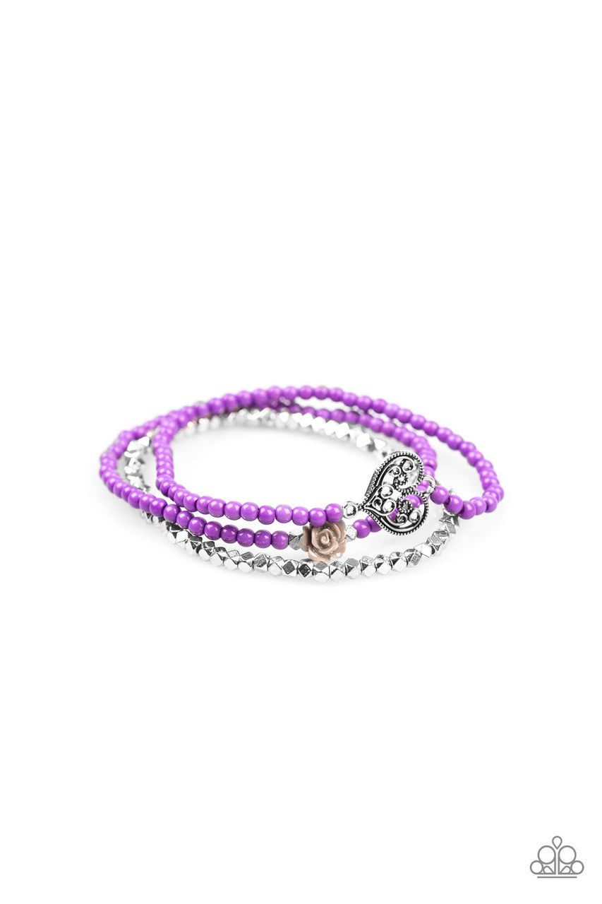 Featuring a gray resin rose and a shimmery silver heart charm, dainty purple beads and faceted silver beads are threaded along stretchy bands for a vintage inspired look.