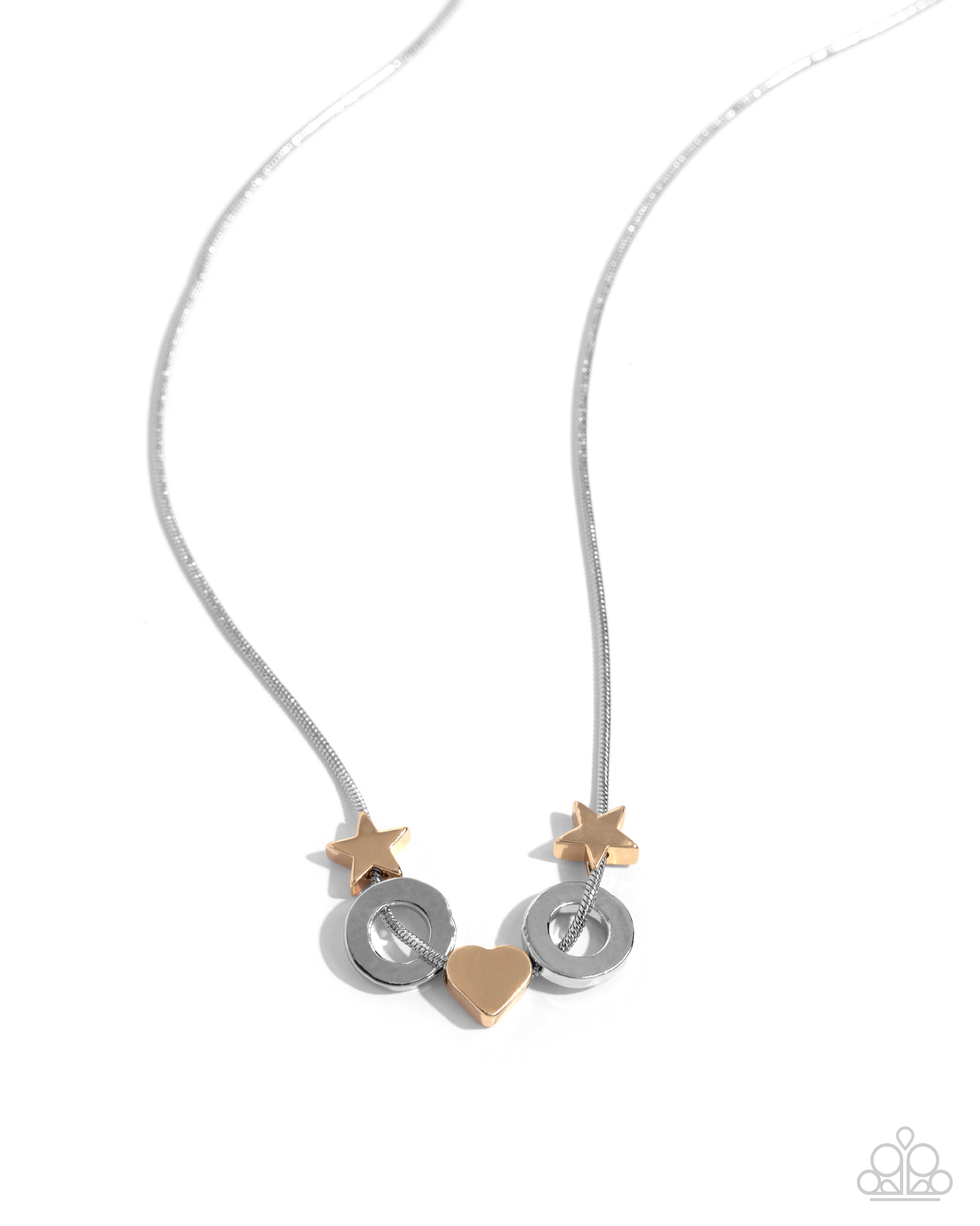 A dichromatic assortment of stars, sleek rings, and a heart in silver and gold finishes glide along a rounded silver snake chain, creating a layered display of charm and class below the collar. Features an adjustable clasp closure.