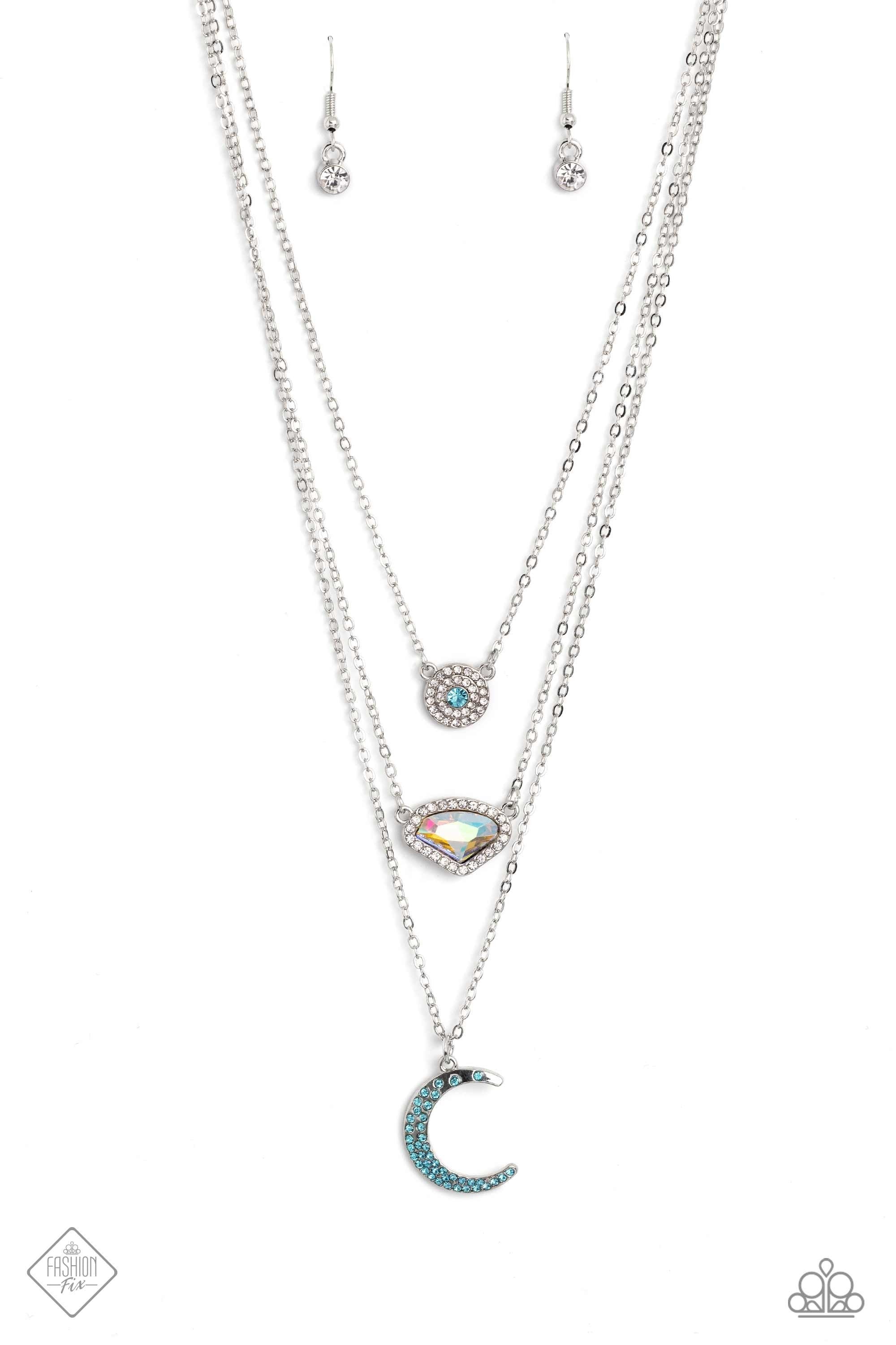 Lunar Lineup - Blue - Iridescent Gem Moon Charm Tiered Paparazzi Short Necklace - August 2023 Sunset Sightings