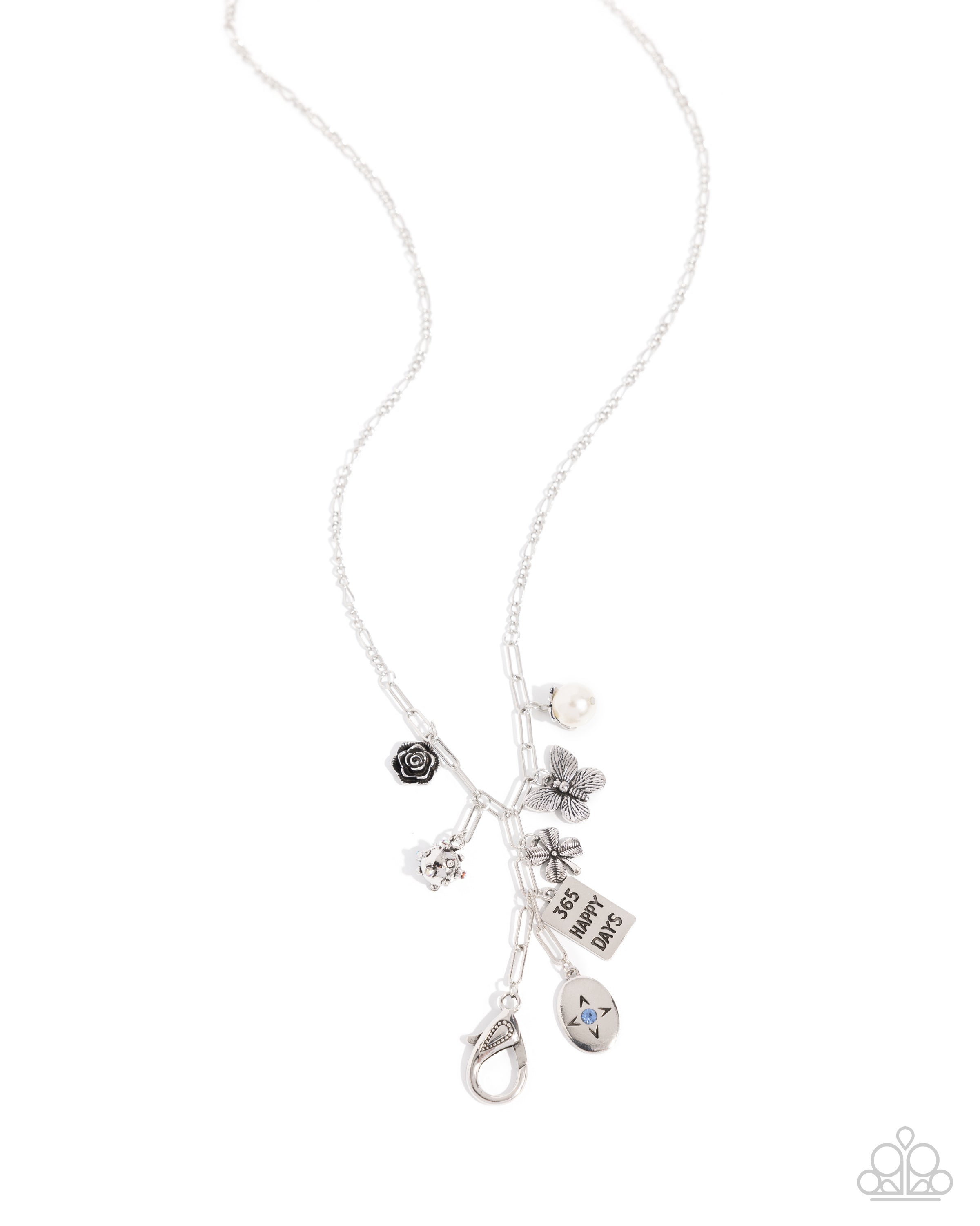A collection of whimsical silver charms, including a clover, a butterfly, a rose, a pearl, a tile engraved with "365 Happy Days," and an oval accented with a blue rhinestone, dangles from a silver chain, creating a playful display. A lobster clasp hangs from the bottom of the design to allow a name badge or other item to be attached. Features an adjustable clasp closure.