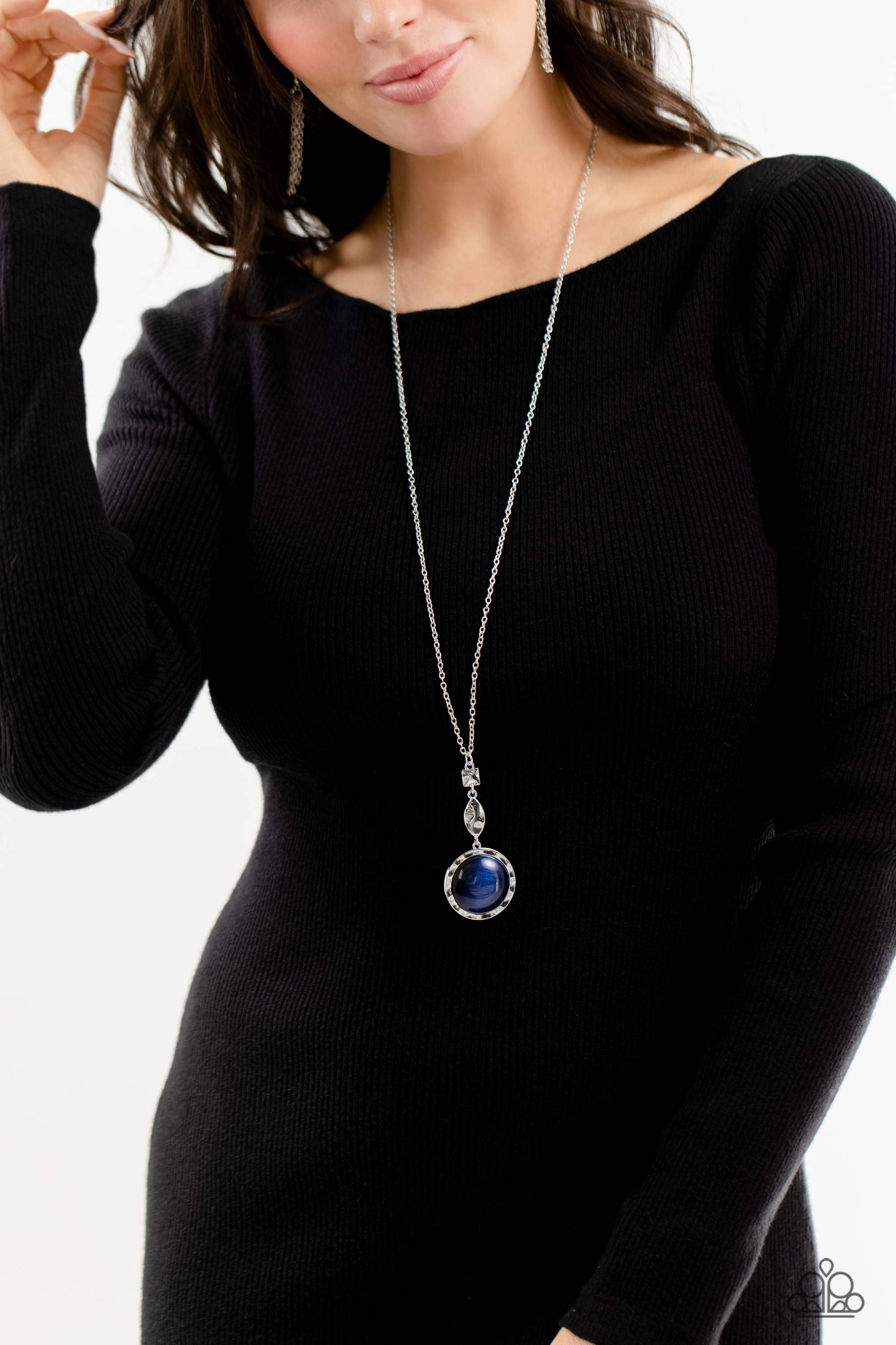 Encased in a hammered silver frame, an oversized blue cat's eye stone pendant swings from the bottom of hammered square and marquise shaped frames that are suspended from an extended silver chain, resulting in a magical centerpiece. Features an adjustable clasp closure.