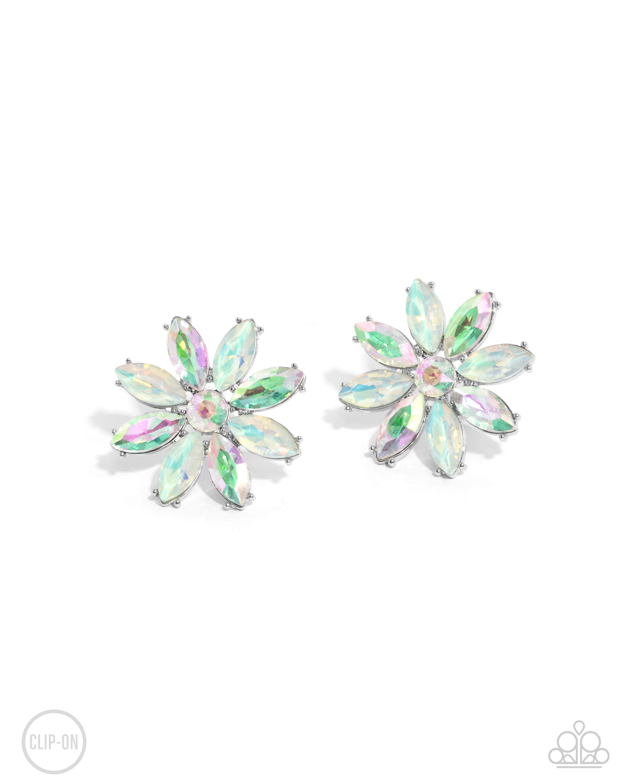 Featuring flashy facets, marquise-cut opalescent green and green UV shimmery petals encircle a round UV shimmery center for a floral, fancy-free look along the ear. Earring attaches to a standard clip-on fitting.