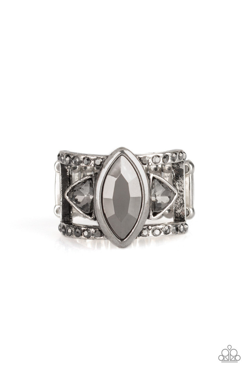 Flanked by smoky triangular rhinestones, a glittery hematite marquise cut rhinestone centerpiece is pressed into the center of two dainty hematite rhinestone encrusted bands for a majestic look. Features a stretchy band for a flexible fit.
