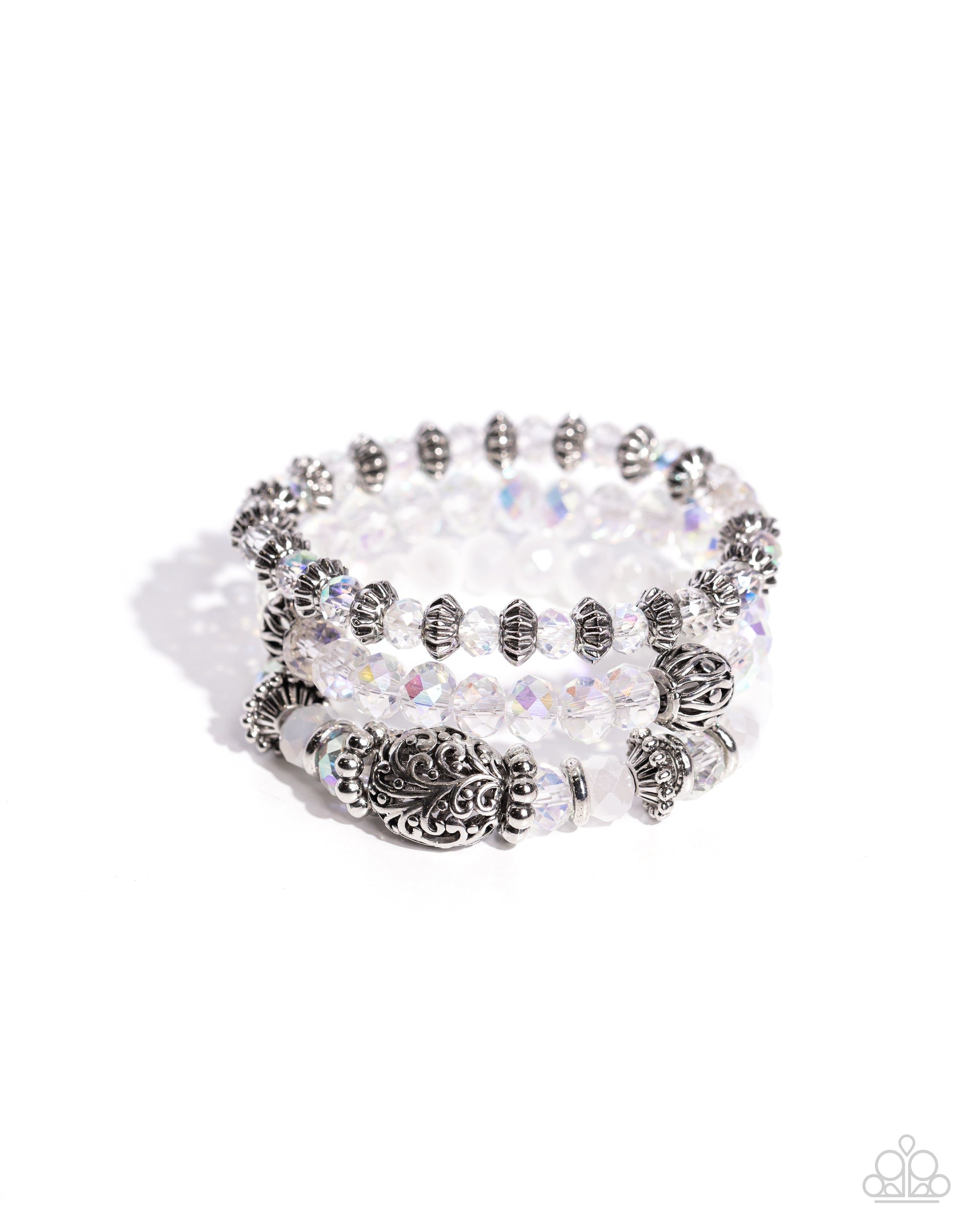 Faceted clear and white beads, various silver beads, and a vintage-embellished oversized bead stack up the wrist on elastic stretchy bands for a classically colorful look.