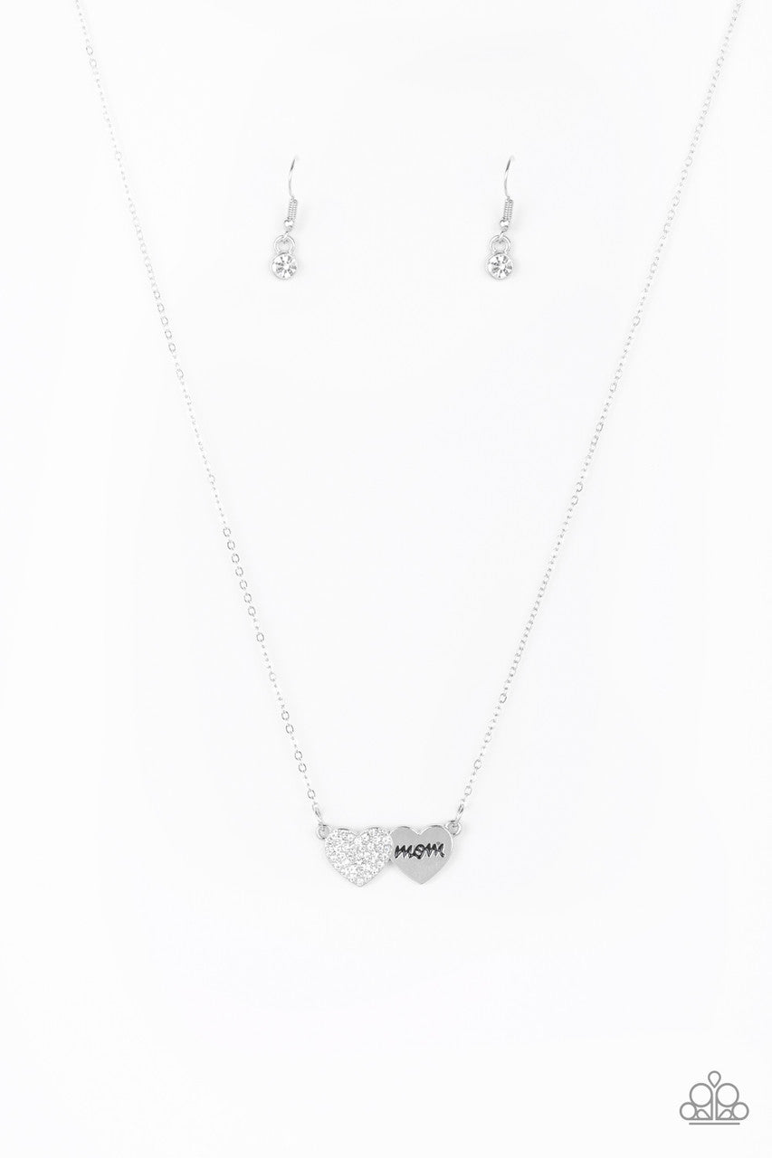 A white rhinestone heart frame and glistening silver heart stamped in the word, "mom", join below the collar for a timeless look. Features an adjustable clasp closure.