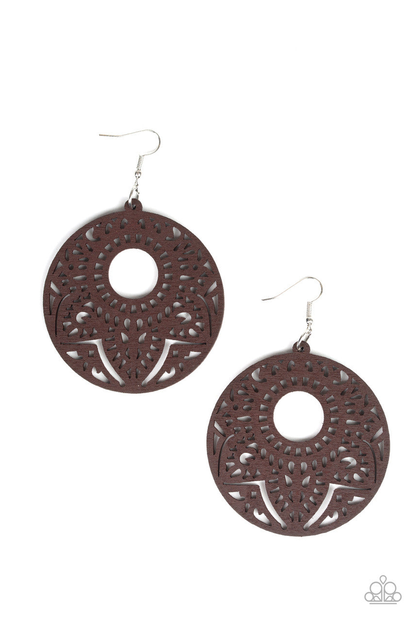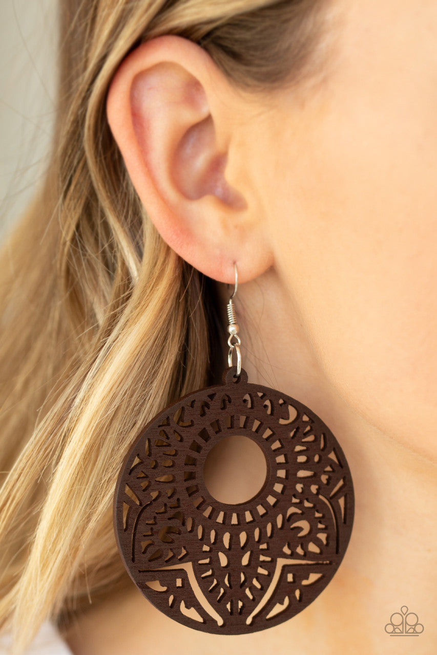 Featuring a mandala-like pattern, a brown wooden frame swings from the ear for a seasonal look. Earring attaches to a standard fishhook fitting.