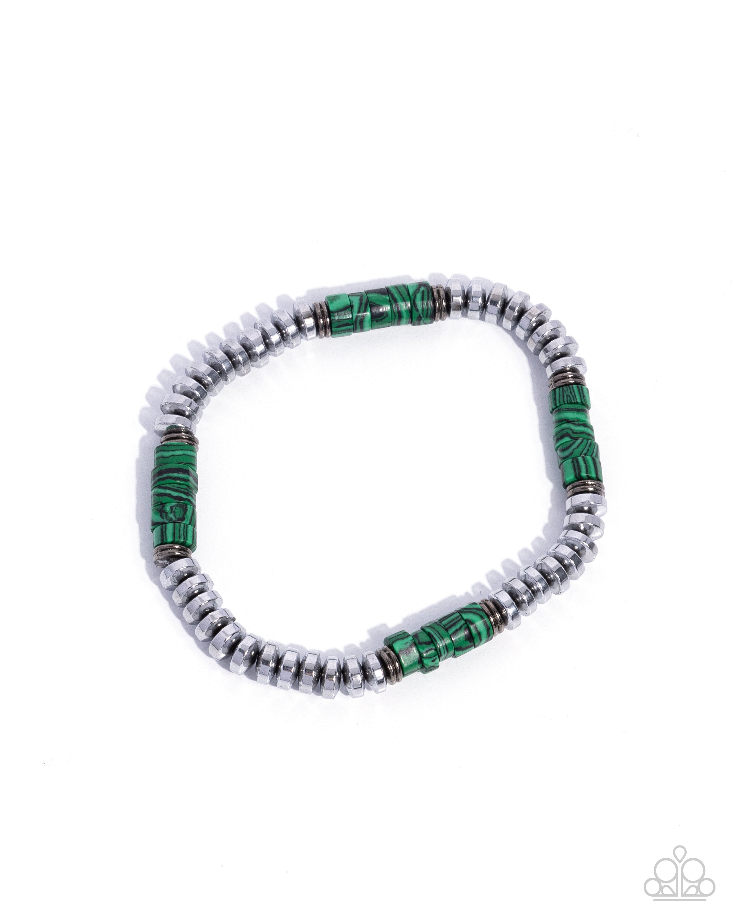 Infused along an elastic stretchy band, a collection of glistening silver discs alternates with sections of green-striped stone discs bordered by duos of glistening gunmetal discs for a marbled medley along the wrist. As the stone elements in this piece are natural, some color variation is normal.