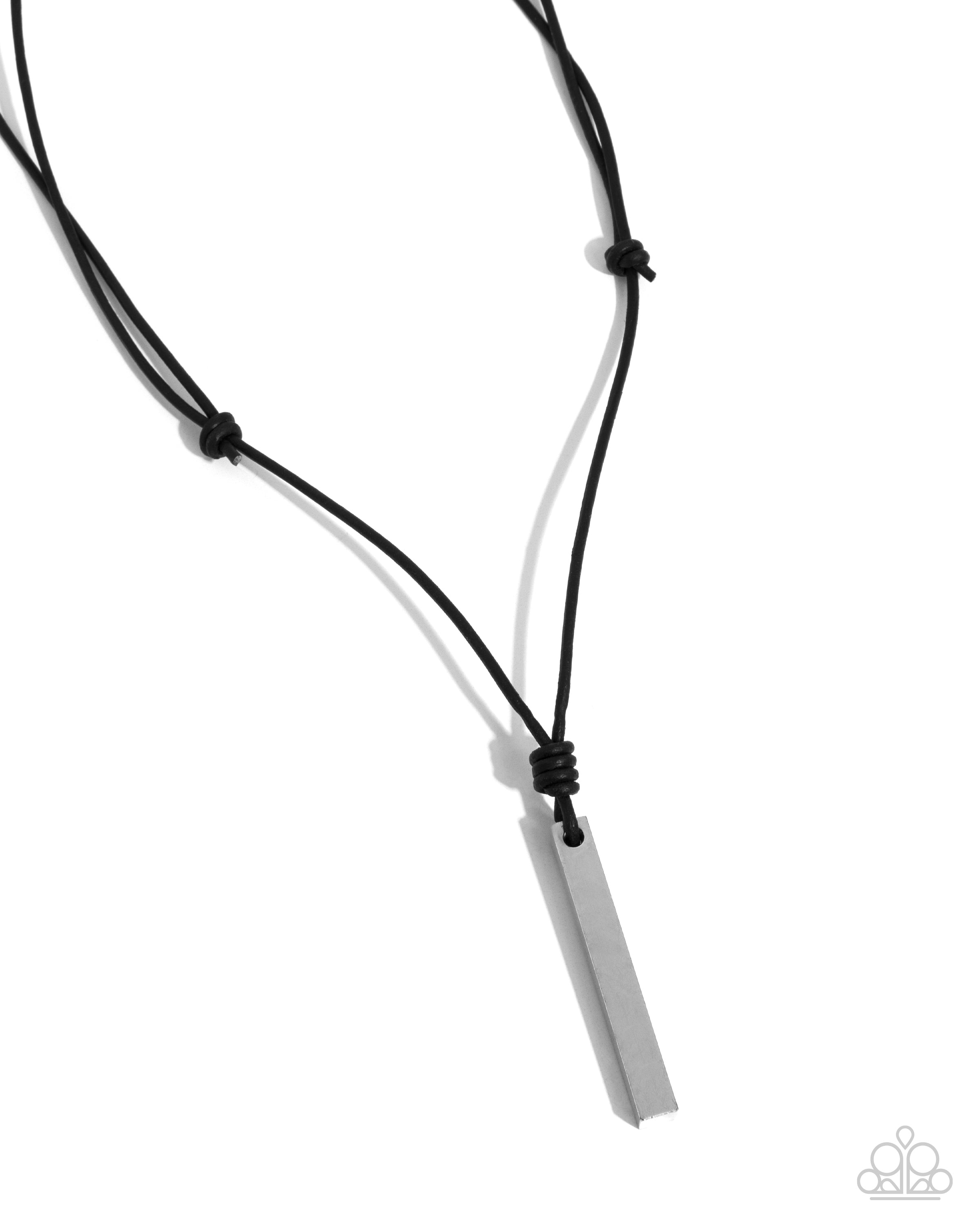 A rectangular silver pendant is knotted in place along a black suede cord, resulting in an edgy pendant. Features an adjustable sliding knot closure.