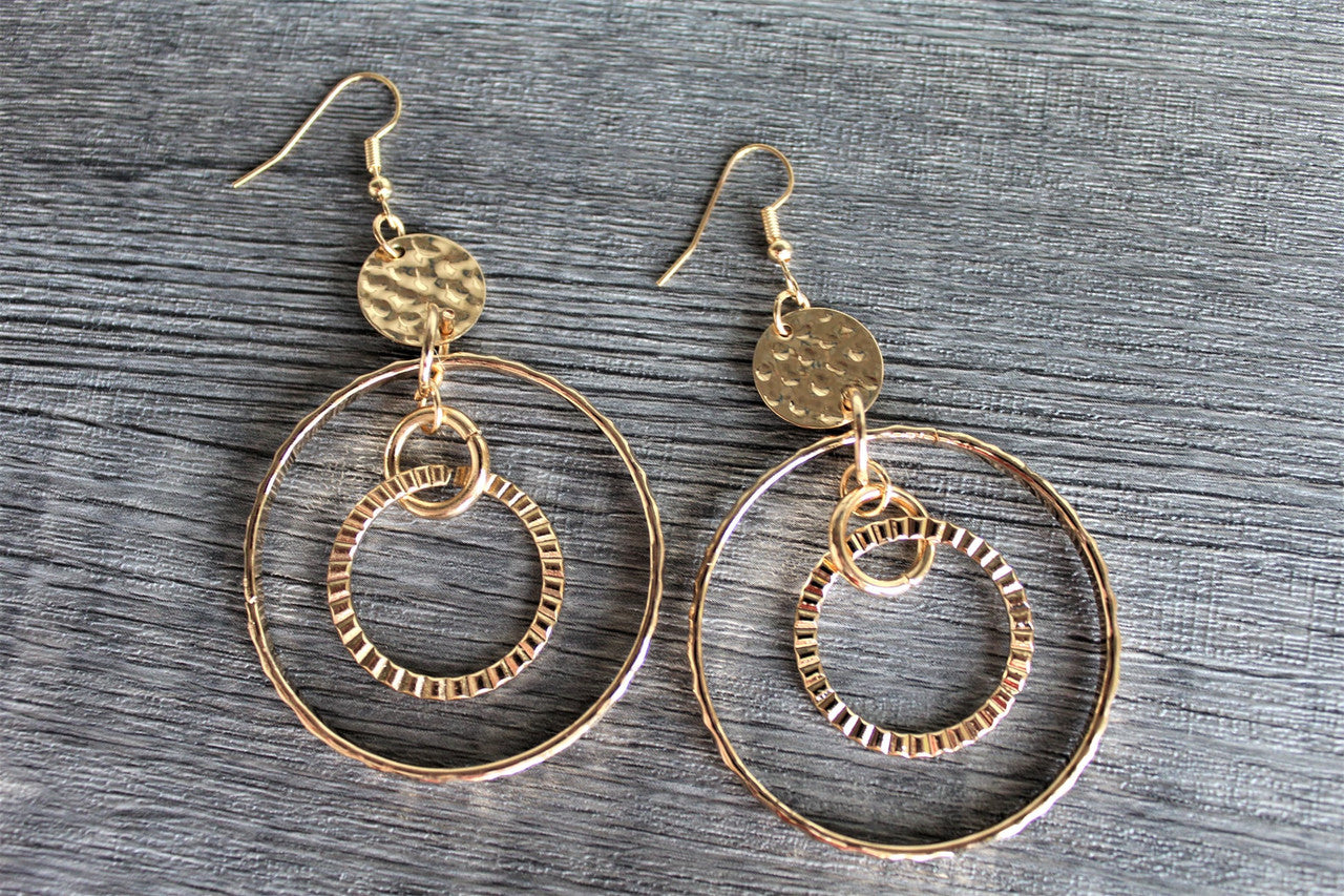 A mismatched pair of hammered and textured gold hoops link at the bottom of a hammered silver disc, creating an edgy lure. Earring attaches to a standard fishhook fitting.