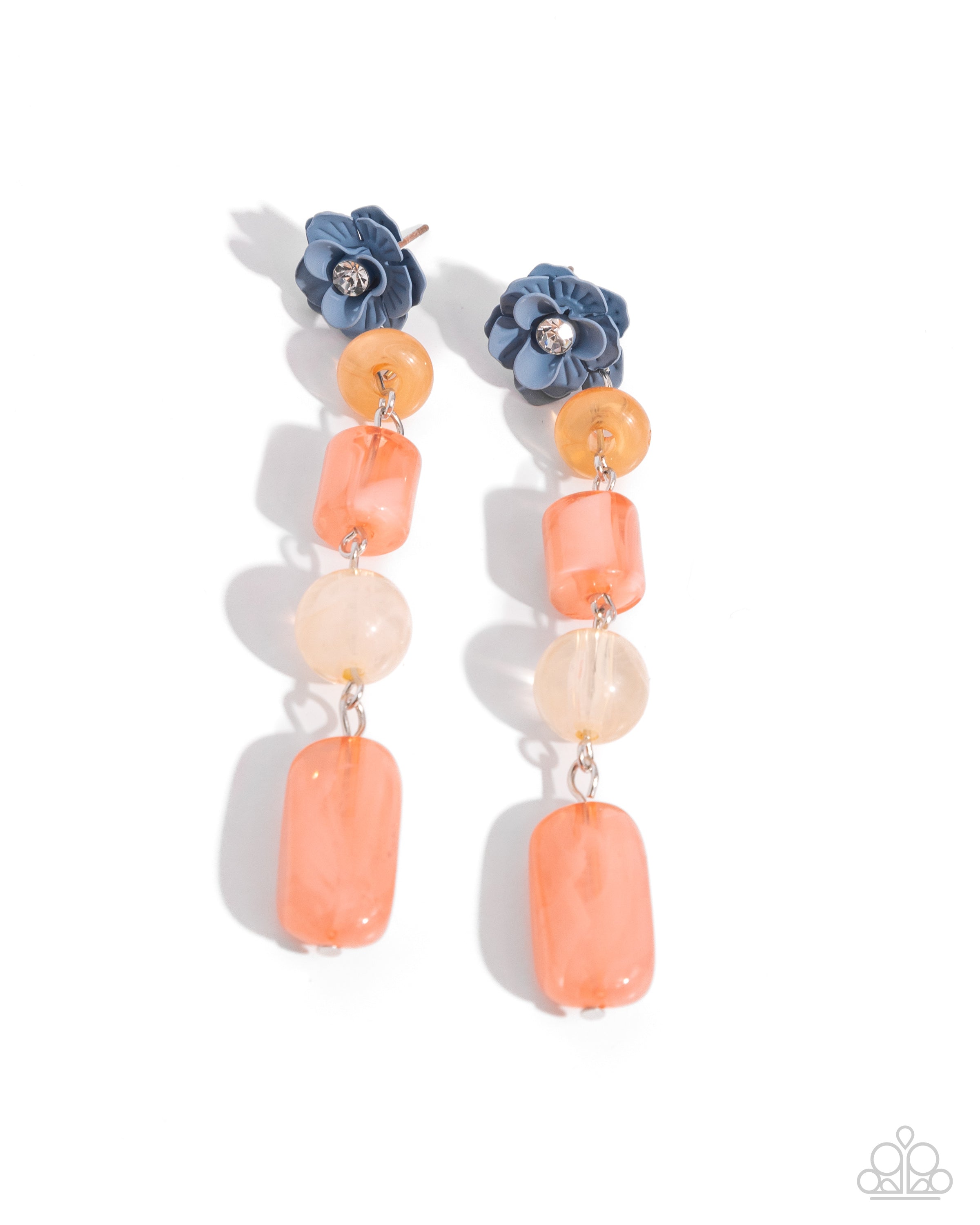 Featuring a white rhinestone center, a collection of textured and sleek Soft Chambray-painted petals bloom from the ear. A collection of light peach, Desert Flower, and champagne beads in various shapes and opacities gives way from the floral post for a chic sway of color and whimsy. Earring attaches to a standard post fitting.
