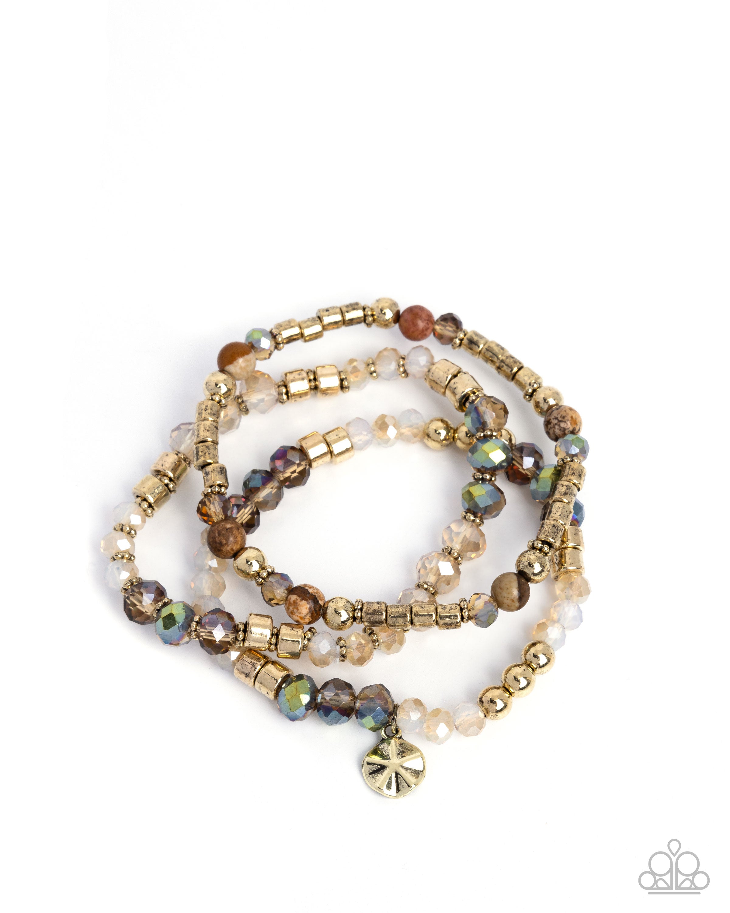 An array of faceted smoky, brown, gold, and metallic beads shimmer with an iridescent finish. Accented by textured gold spacers and a dainty stamped charm with a starburst design, this layered set exudes a celestial-inspired elegance.