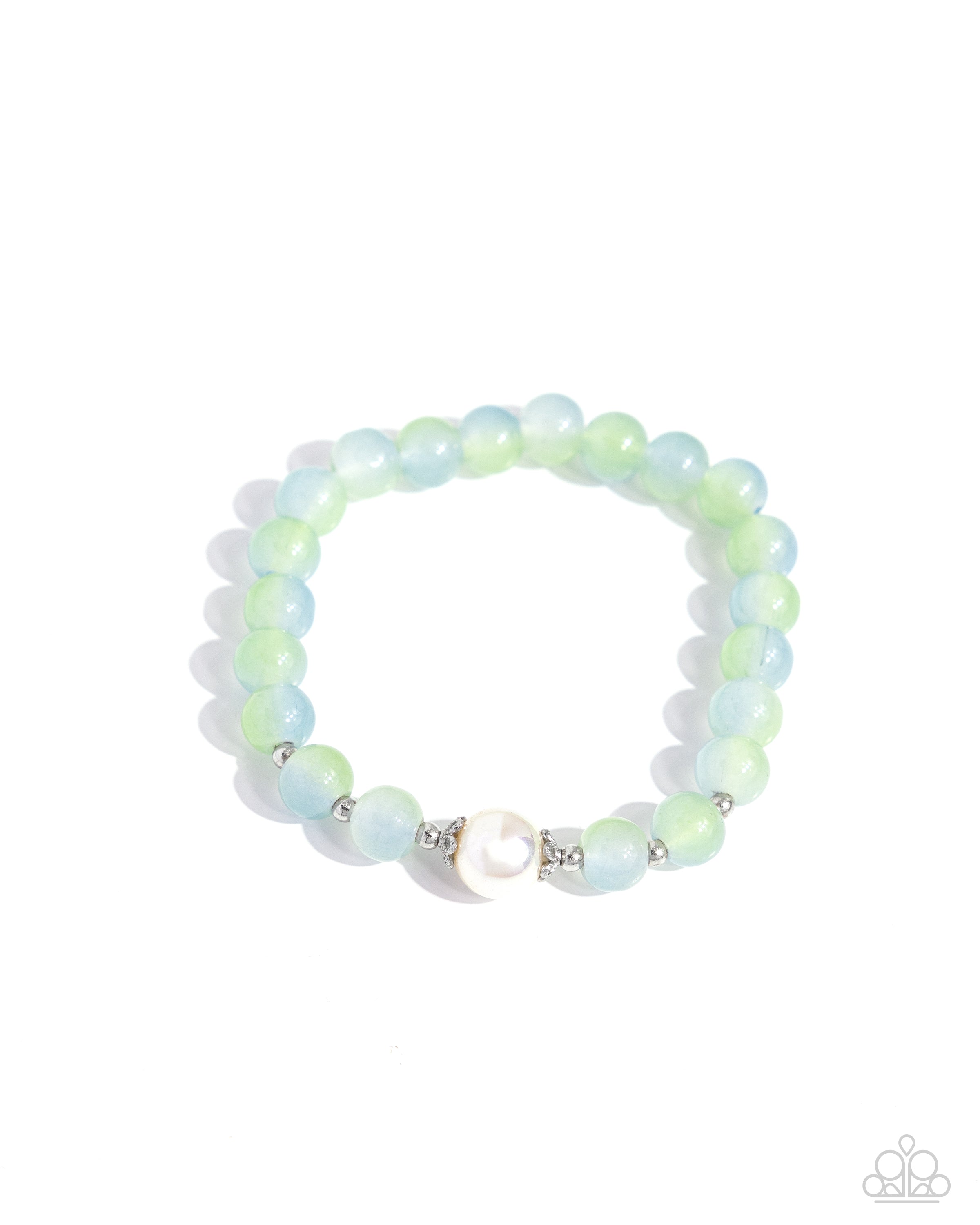 Blue to green ombré beads, dainty silver beads, and an iridescent-dipped pearl are infused along an elastic stretchy band along the wrist for a mermaid-inspired masterpiece.