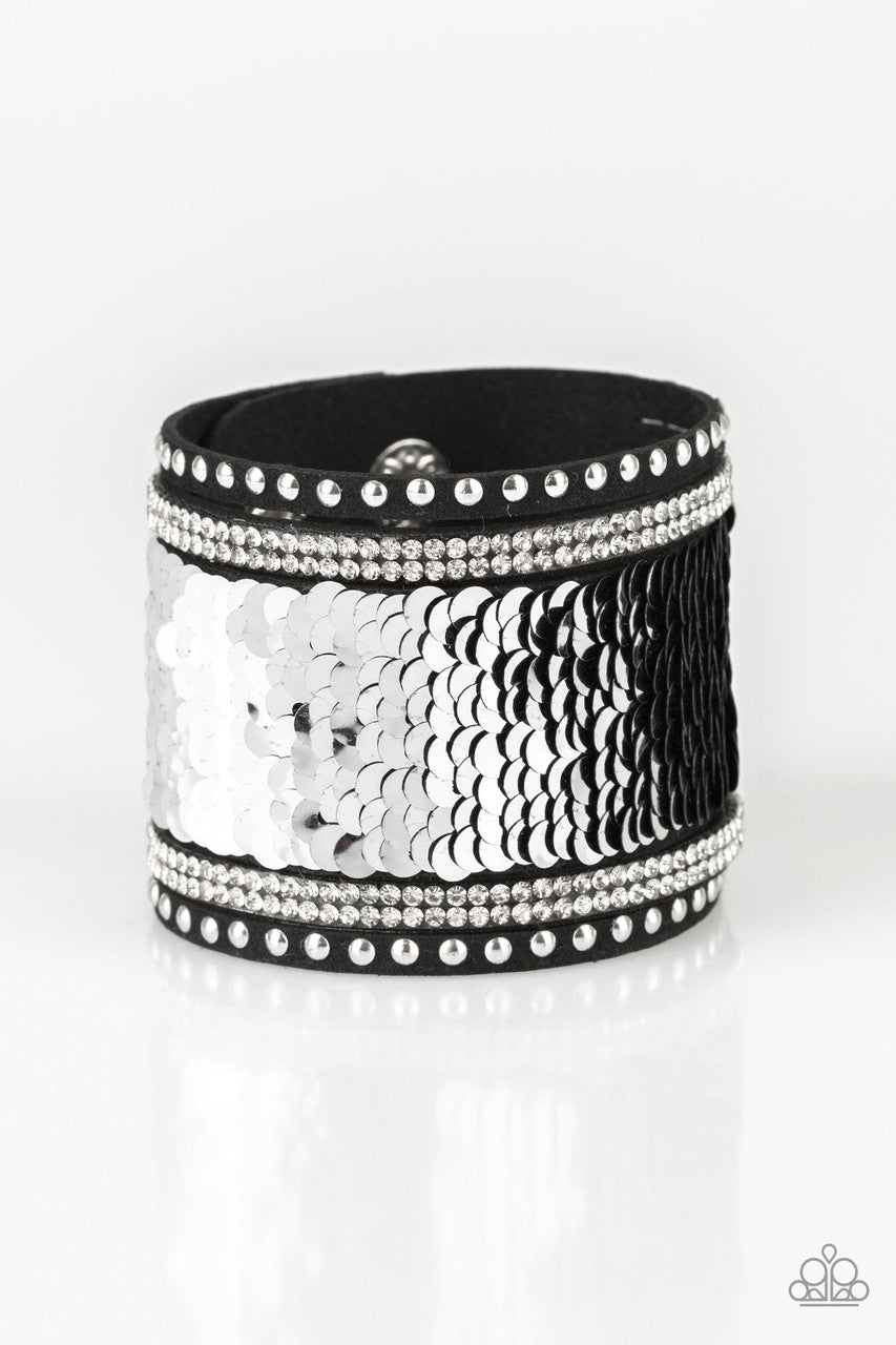 Shiny silver studs, glassy white rhinestones, and shimmering sequins are sprinkled across a thick black suede band that has been spliced into five glittery rows. Bracelet features reversible sequins that change from black to silver. Features an adjustable snap closure.