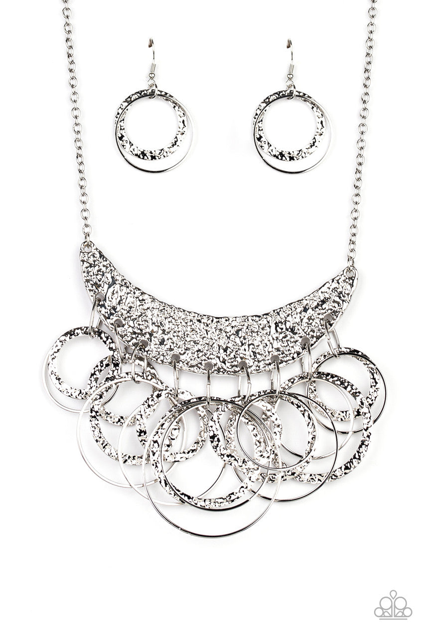 Hammered and embossed in a foil-like finish, a silver moon-like frame bows below the collar. Dainty silver hoops and matching hammered rings cascade from the bottom, creating an edgy fringe. Features an adjustable clasp closure.