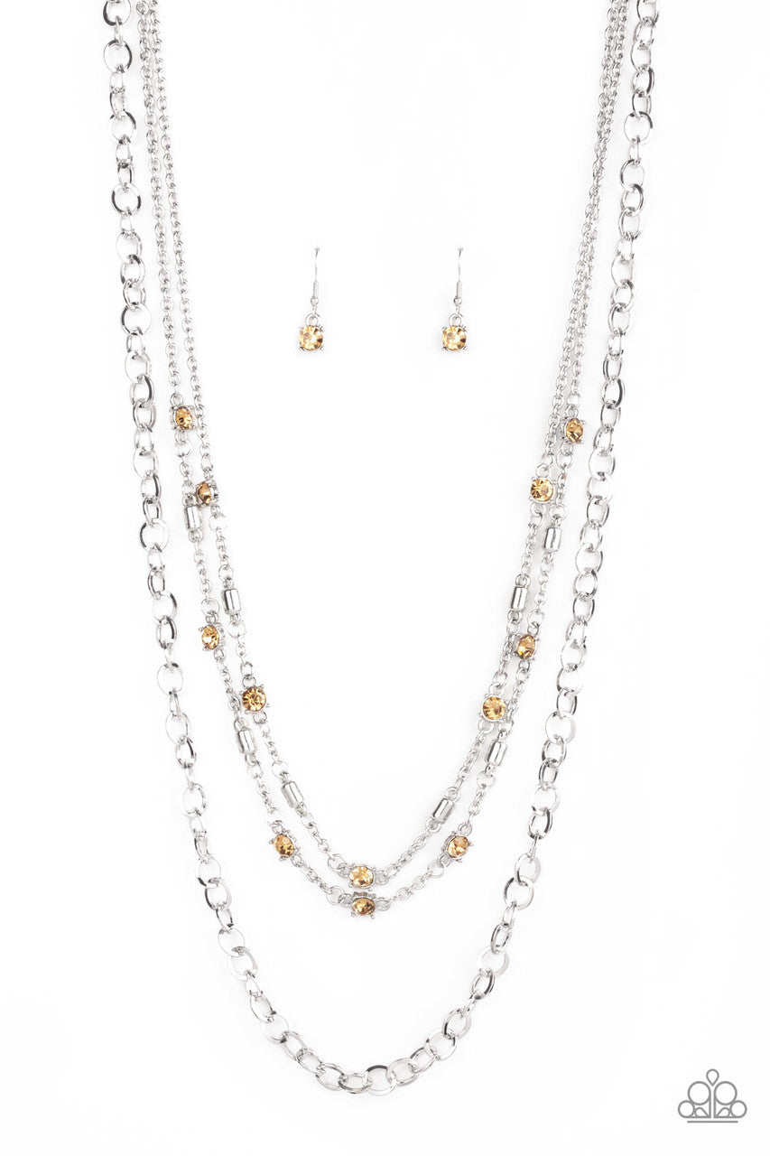 Dotted with golden topaz rhinestones and glistening silver accents, a collision of mismatched silver chains layer down the chest for a refined flair. Features an adjustable clasp closure.
