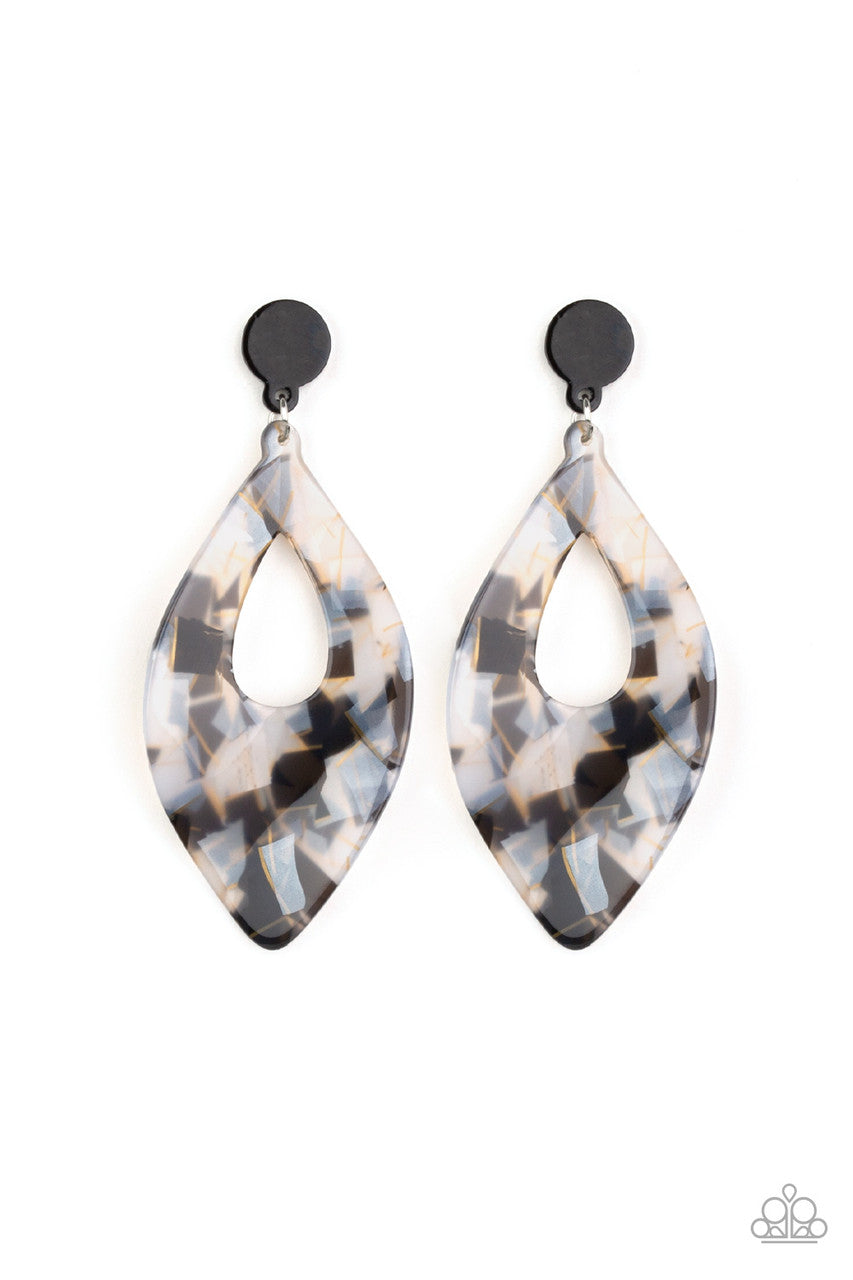 Featuring a shimmery geometric finish, an abstract acrylic lure attaches to a simple black acrylic fitting for a retro inspired look. Earring attaches to a standard post fitting.