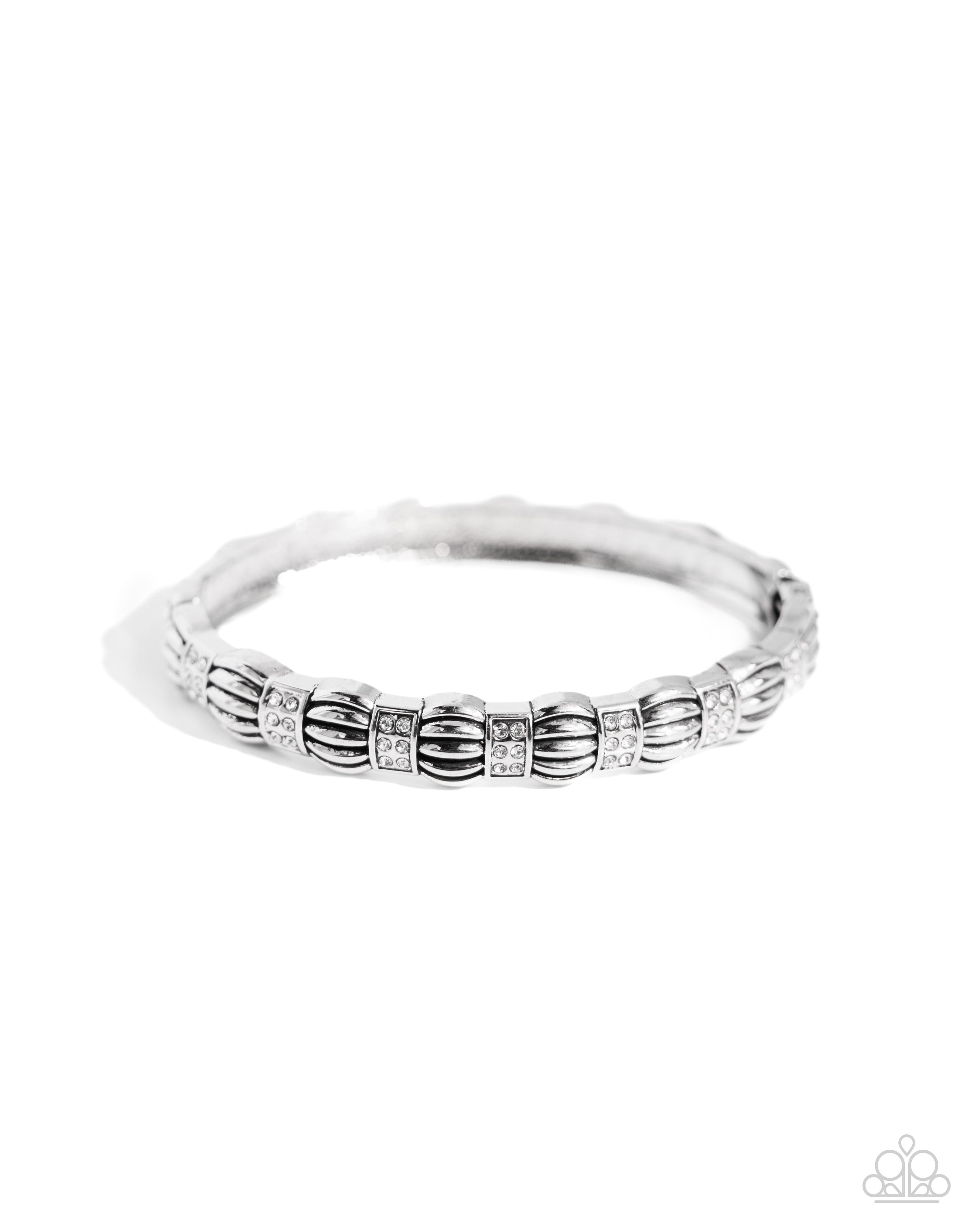 Rectangular silver frames dotted with dainty white rhinestones alternate with rippling silver accents around the wrist, coalescing in a versatile bangle-like bracelet. Features a hinged closure.