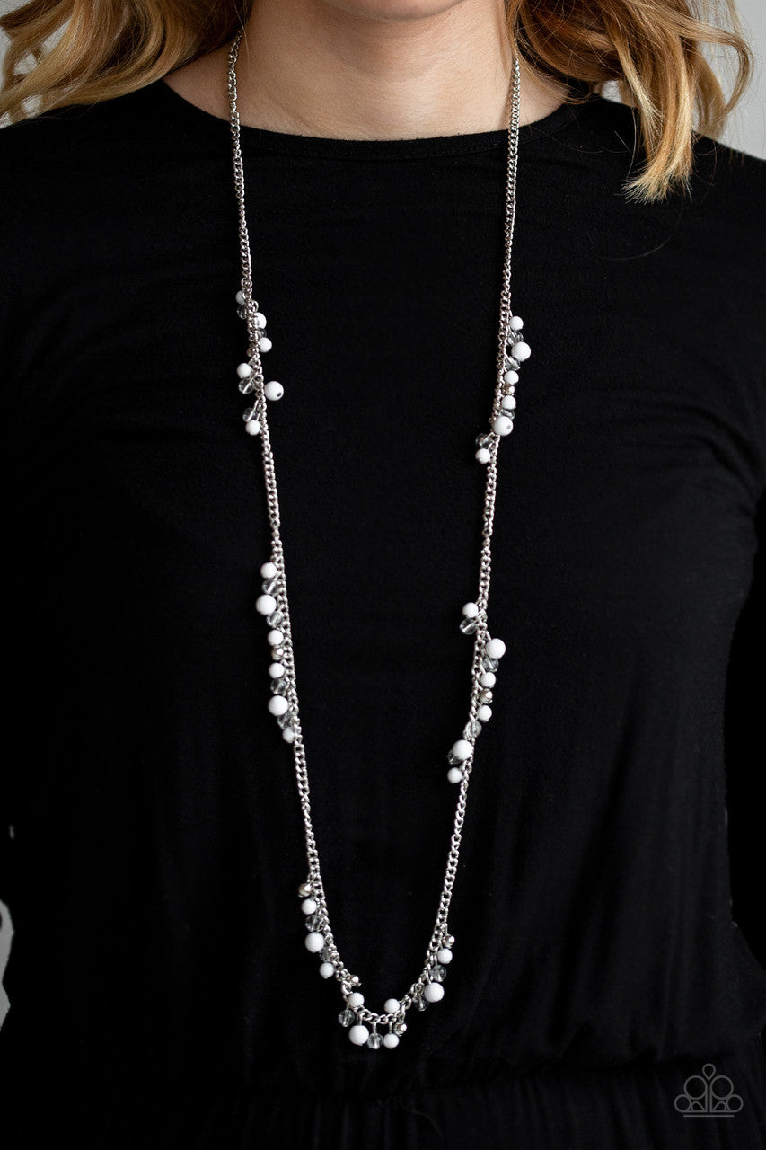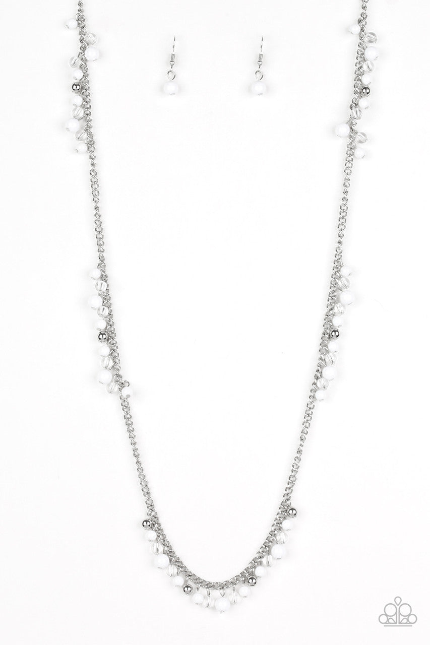 Sections of shiny silver, polished white, and glassy beads trickle along a shimmery silver chain along the chest for a flirtatious look. Features an adjustable clasp closure.