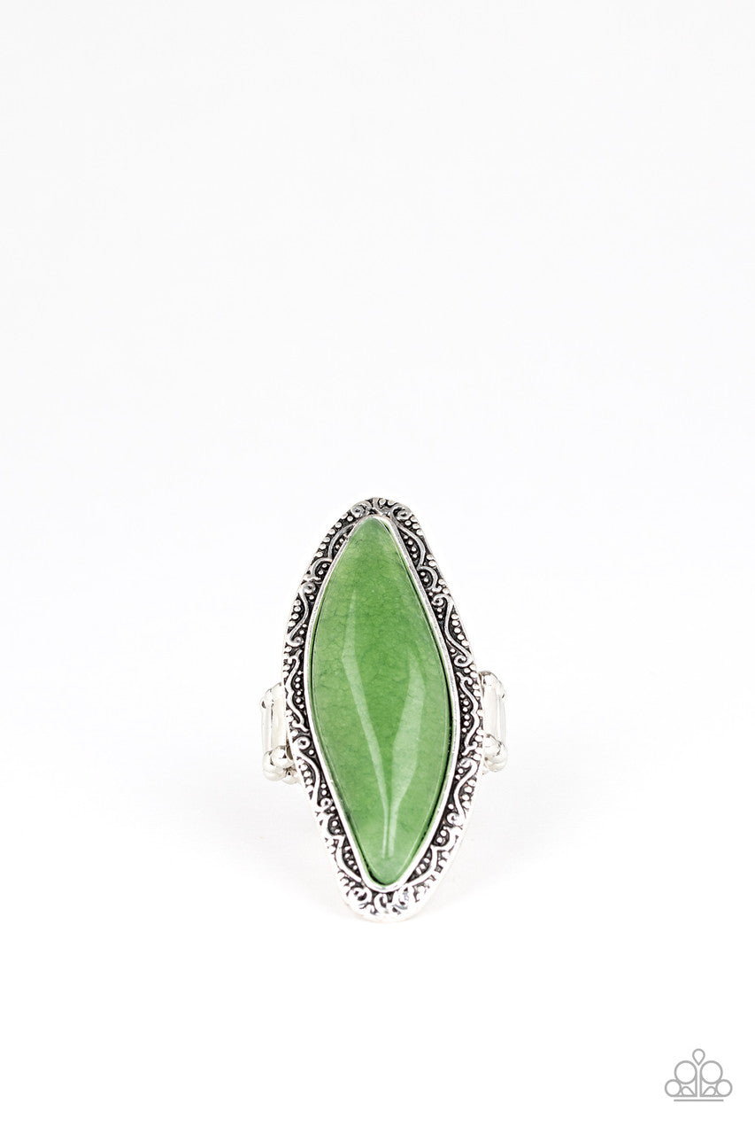 An oblong green stone is pressed into a shimmery silver frame embossed and studded in tactile filigree, creating a dramatic stone display atop the finger. Features a stretchy band for a flexible fit.
