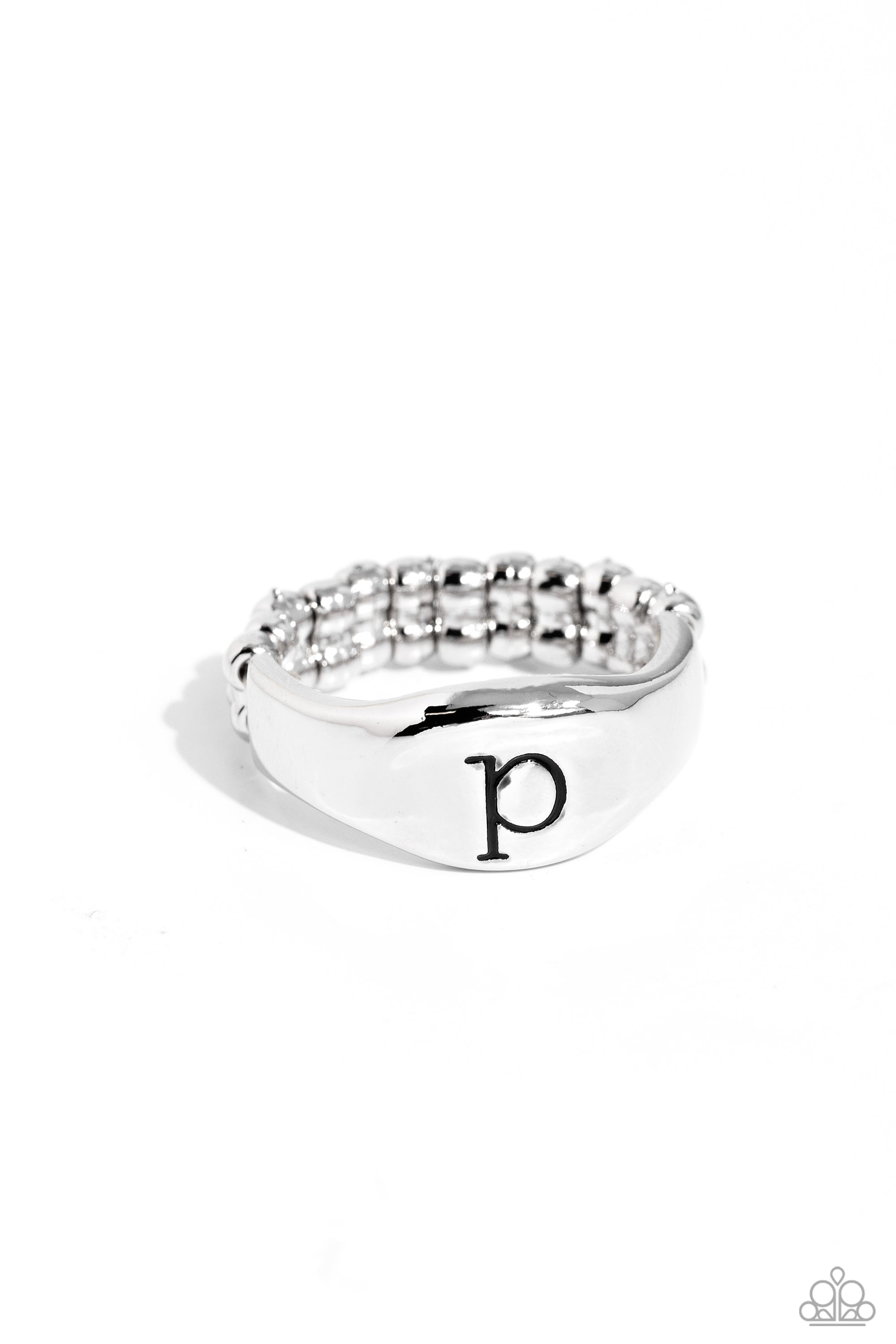 Pressed into the center of a beveled silver band, the black letter "p" stands out for a simple, sentimental centerpiece. Features a stretchy band for a flexible fit.