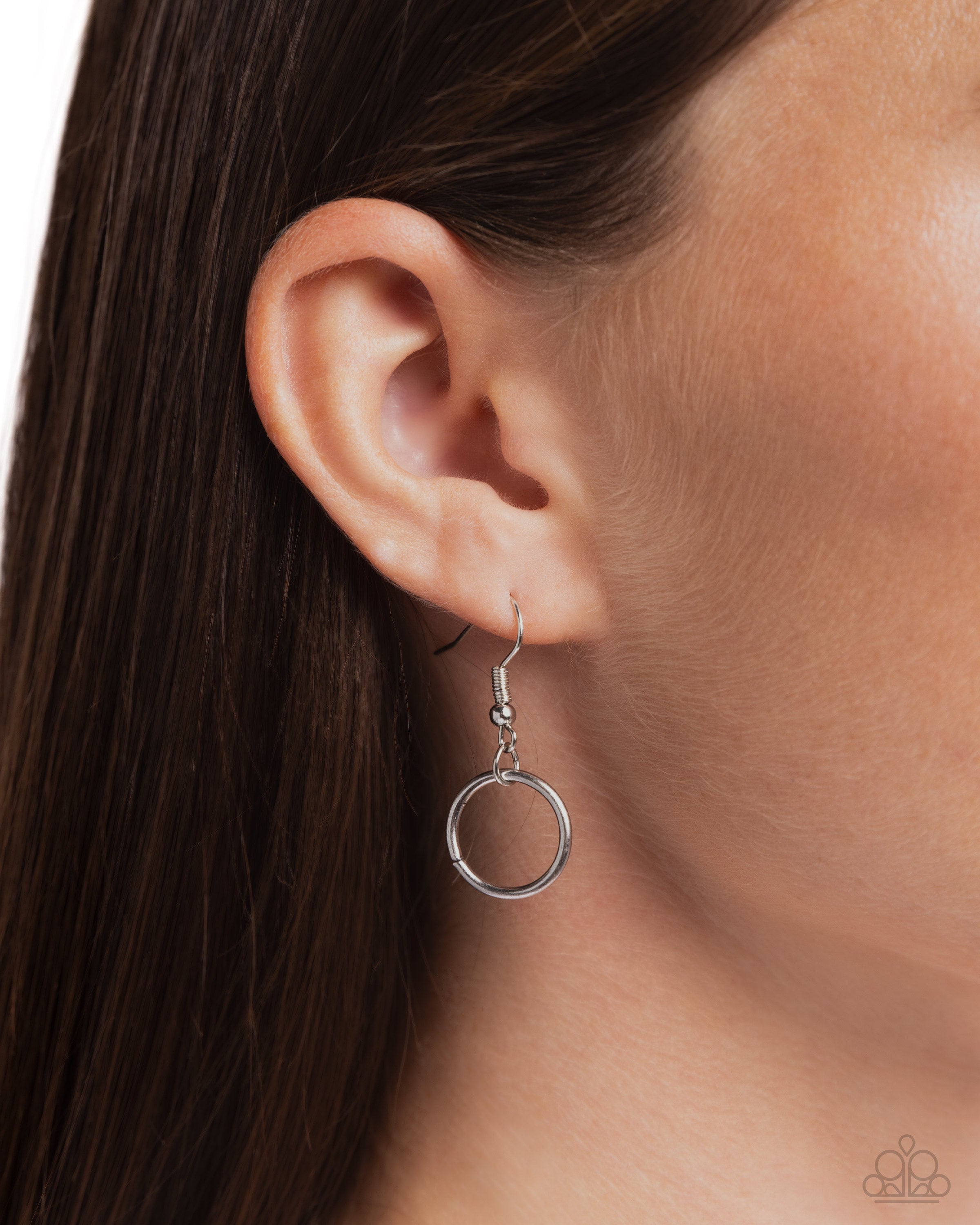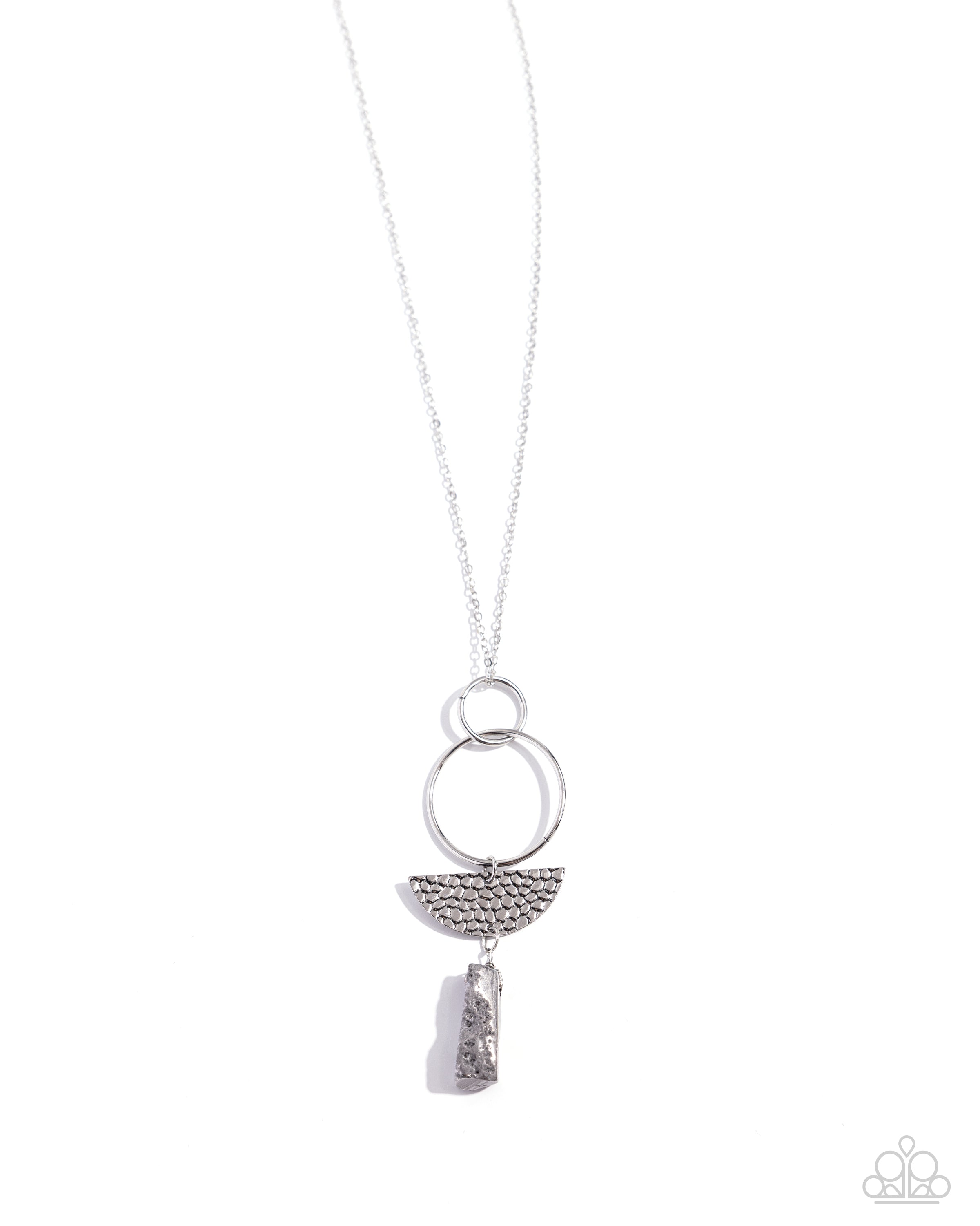 Silver hoops, a slice of textured semi-circle disc, and a hammered silver obelisk all dangle from a long chain for a trend-setting combination. Features an adjustable clasp closure.
