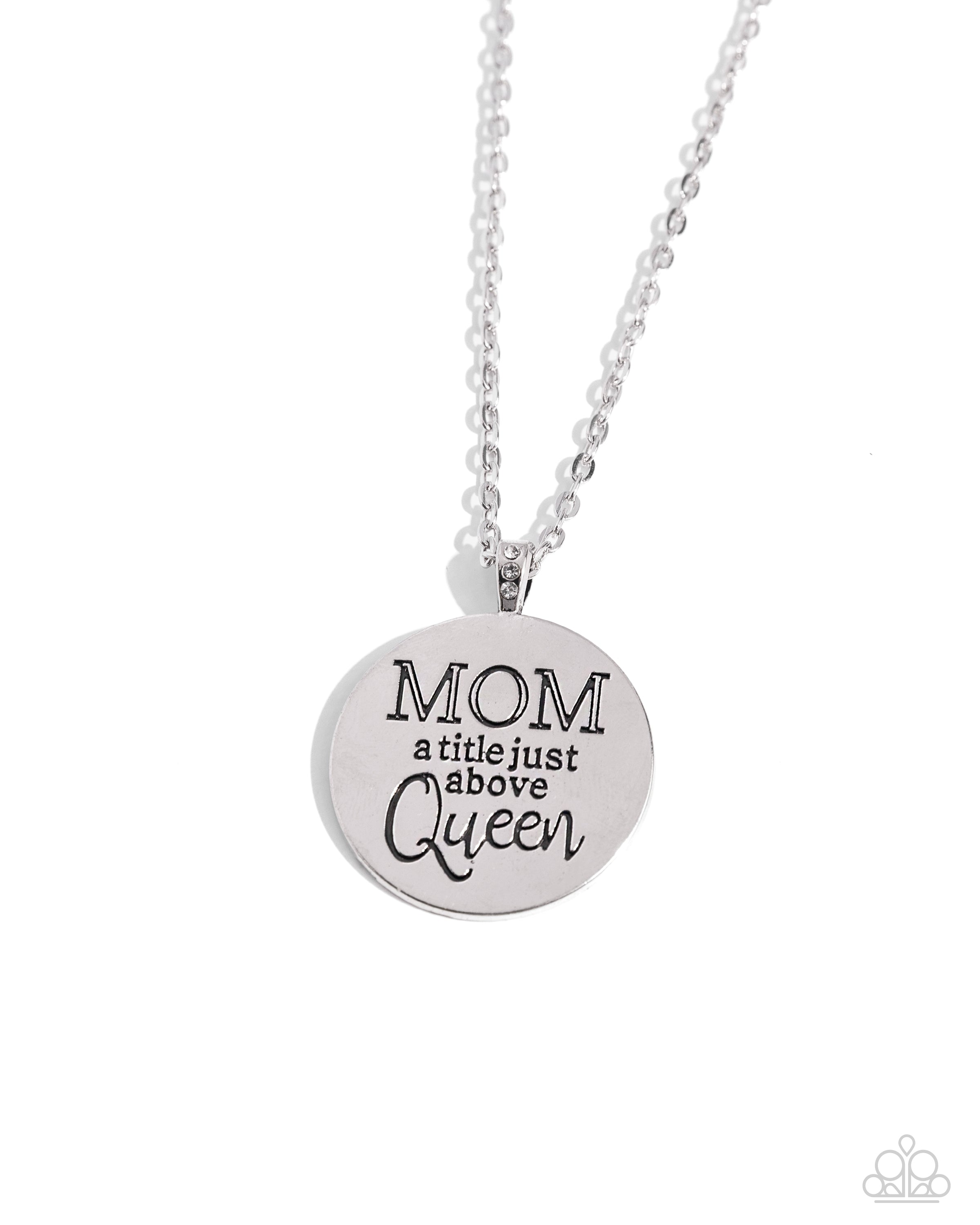At the bottom of a shiny silver chain, a shiny silver disc is stamped with the phrase, "MOM a title just above Queen". The clasp attaching the disc to the chain features a collection of dainty white rhinestones, adding a hint of sparkle to the sentimental statement piece. Features an adjustable clasp closure.
