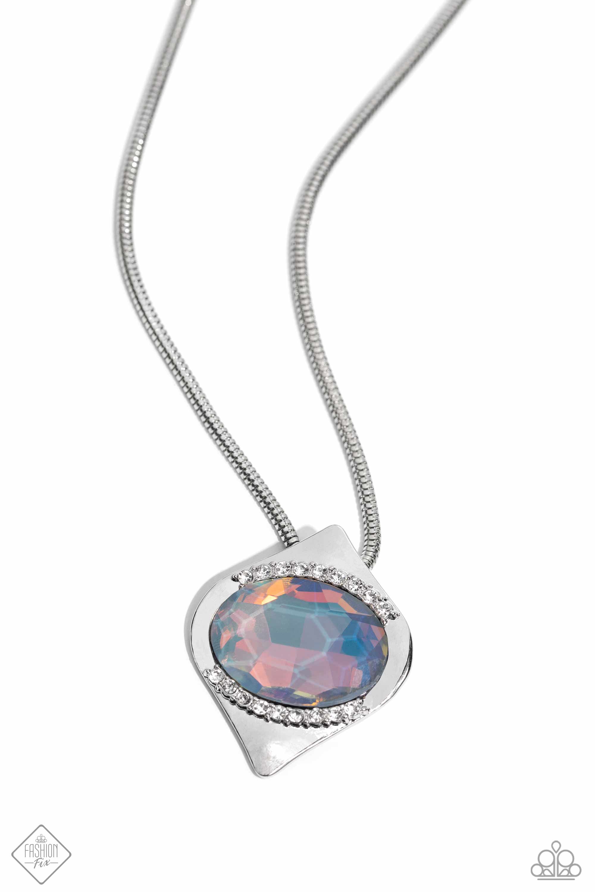 Gliding along a silver snake chain, an opalescent oval gem, pressed in a pinched, abstract silver frame coalesces below the collar for an independent shimmer. Dainty white rhinestones encrust along the frame for an additional touch of refinement. Features an adjustable clasp closure.