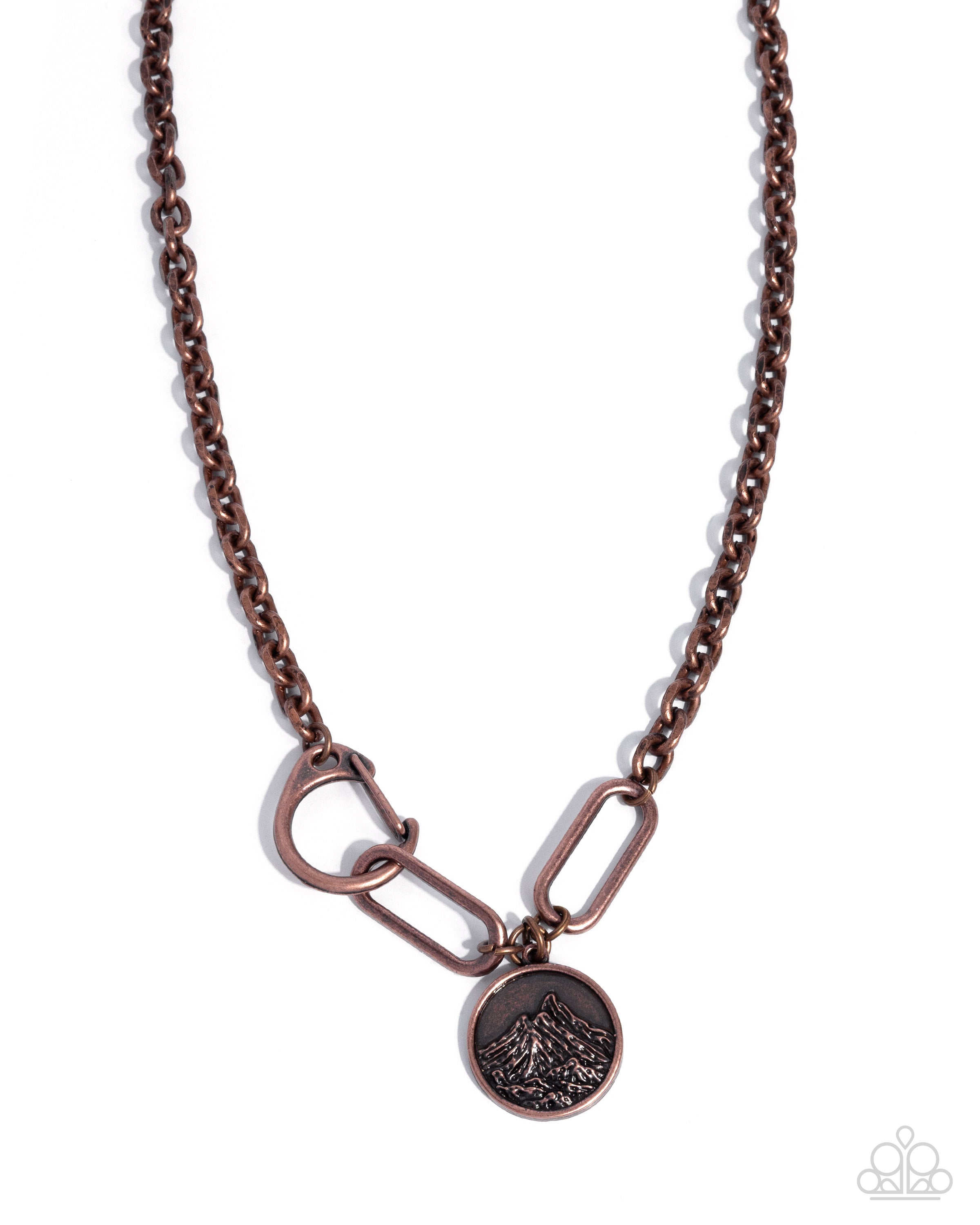 Featuring an abstract copper chain that connects to elongated copper links, a mountain landscape-embedded copper disc sways below the neckline for a rustically radiant look. Features a clasp closure.