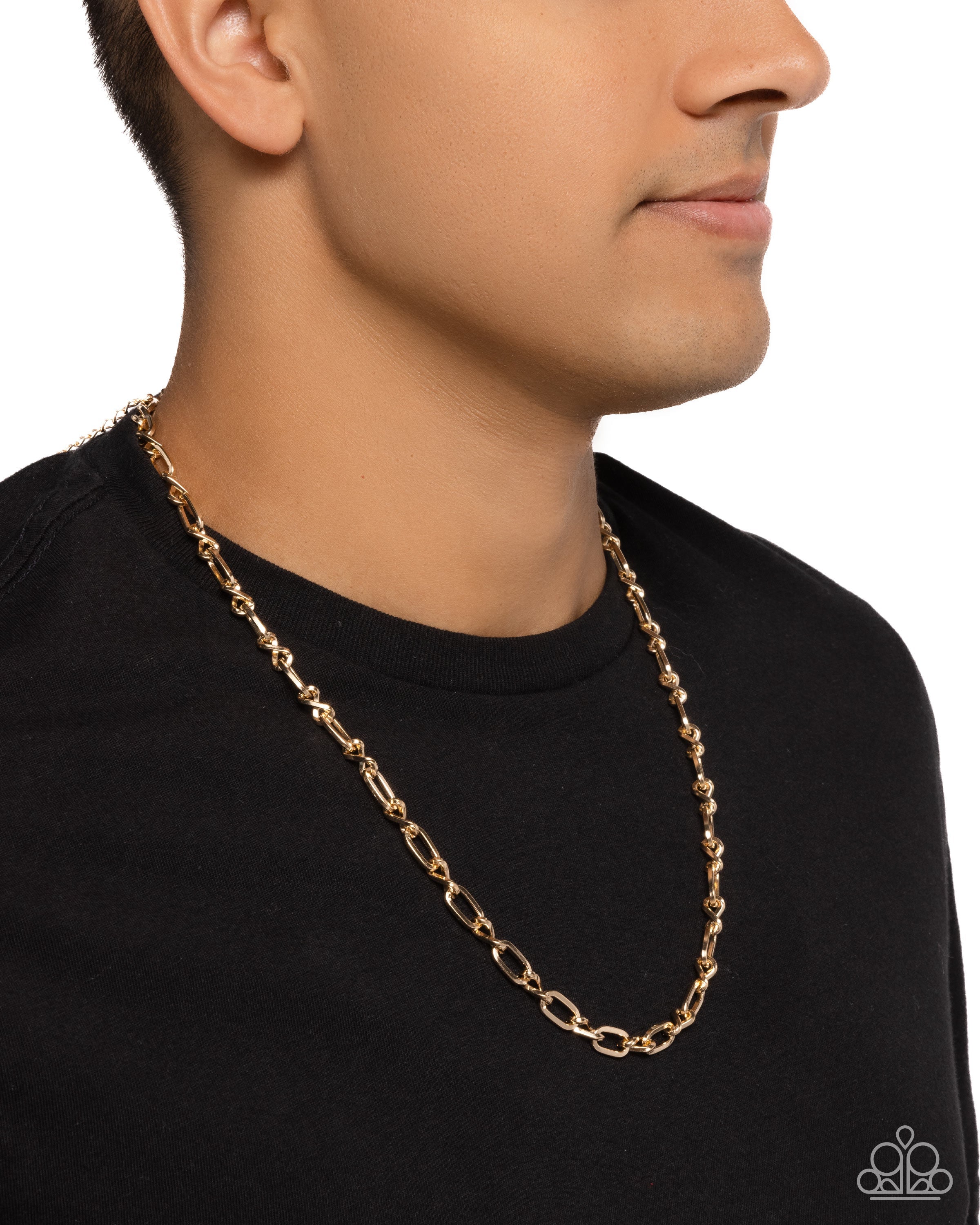 Alternating along the neckline, a collection of high-sheen oval gold links connect to infinity-like gold twists for a suave self-asserting statement. Features an adjustable clasp closure.