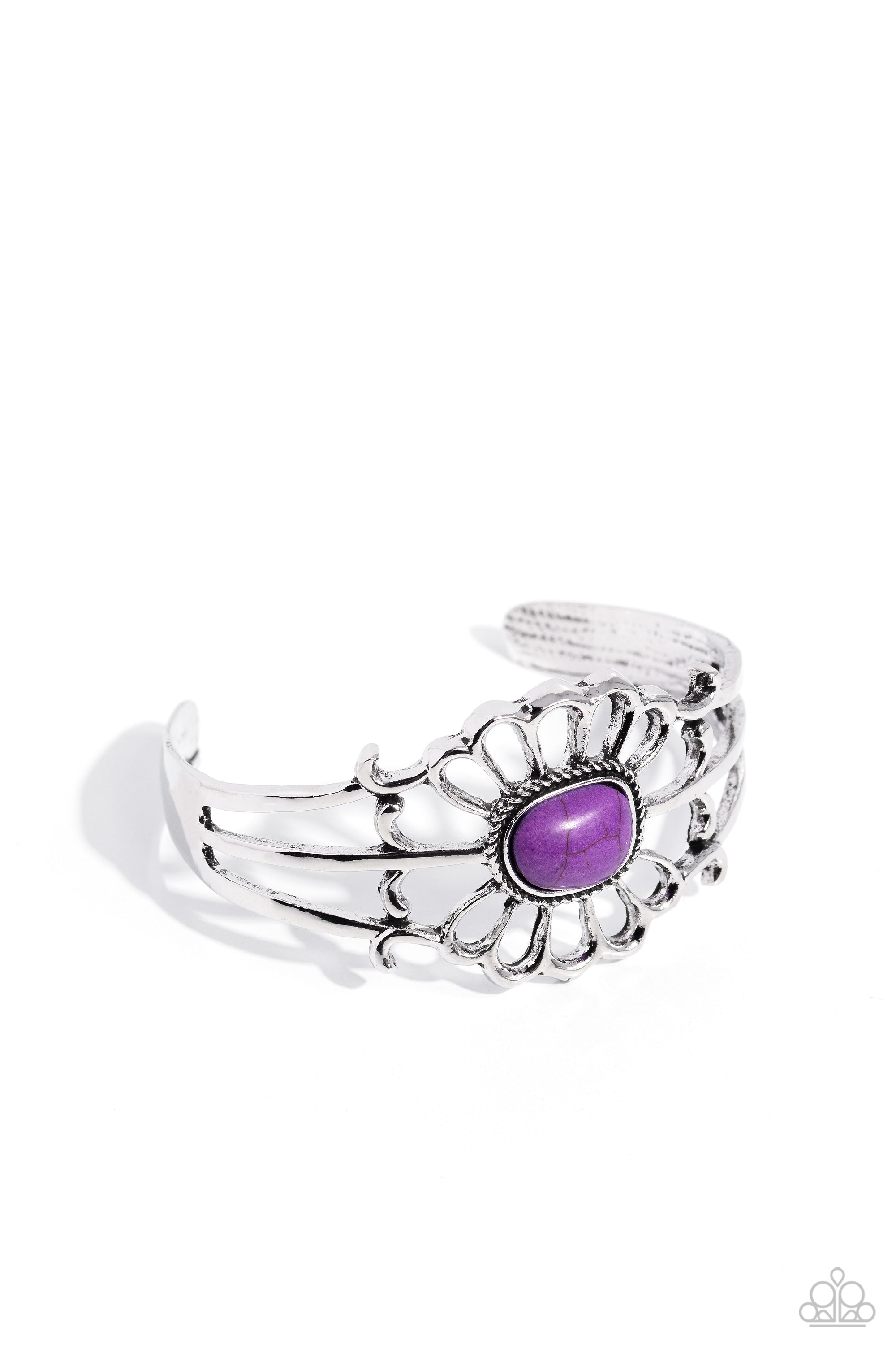 Featured in the center of three silver bands arcing across the wrist, an ornate airy frame with a purple stone center creates an earthy centerpiece for the skin to peek through.