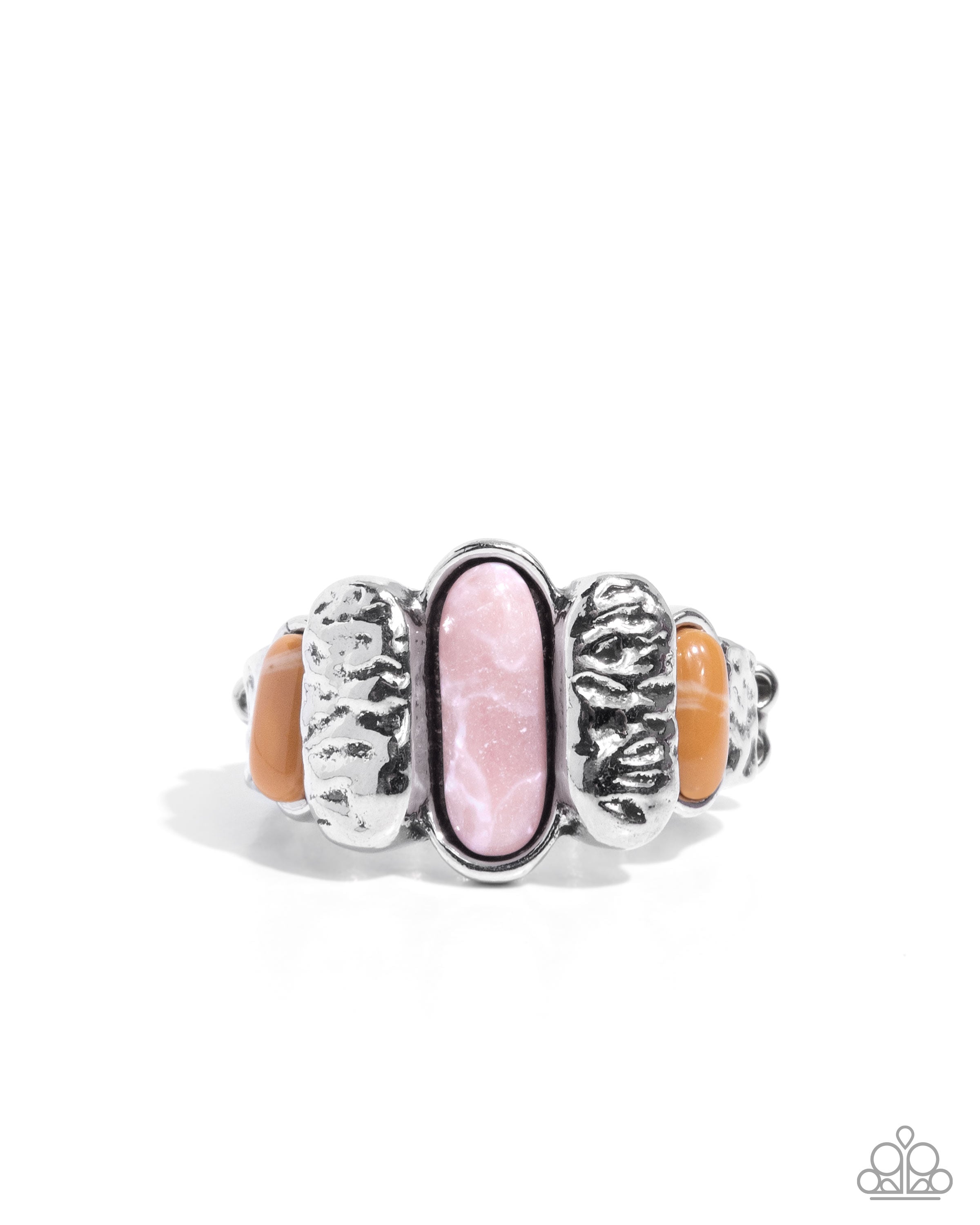 Textured silver ovals are patterned with marbled pink and orange stones atop the finger for a rustic and earthy design. Features a stretchy band for a flexible fit. As the stone elements in this piece are natural, some color variation is normal.