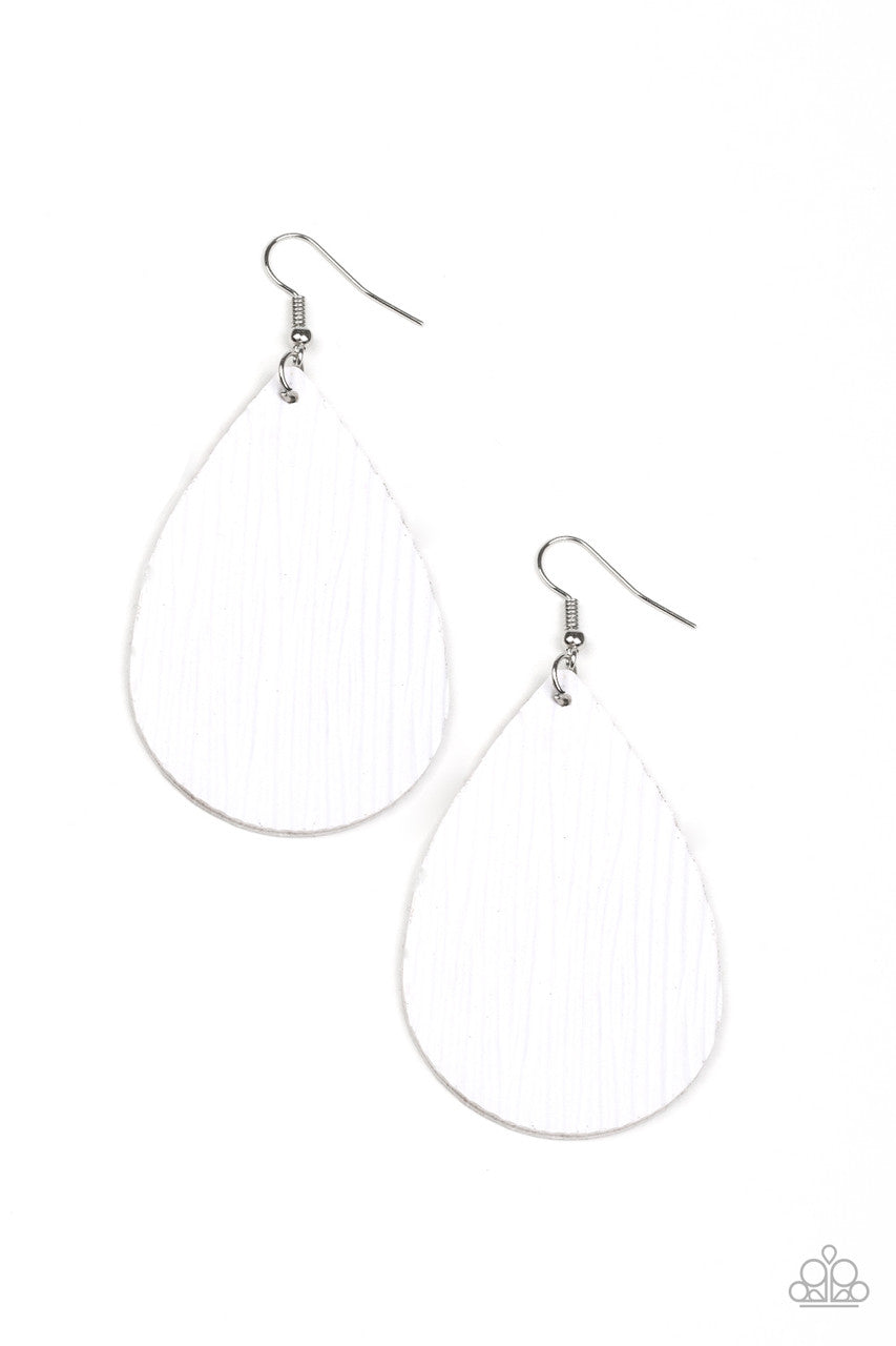 Featuring a nature inspired pattern, an earthy white leather teardrop swings from the ear for a trendy vibe. Earring attaches to a standard fishhook fitting.